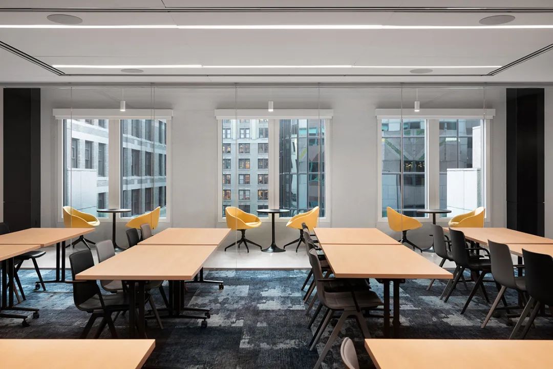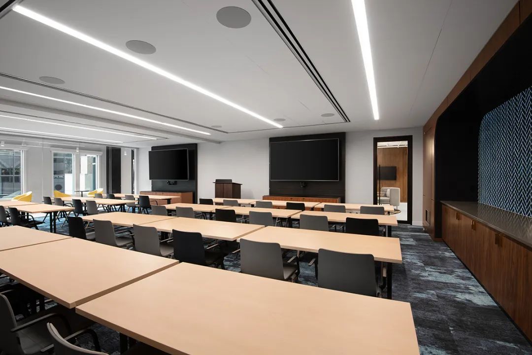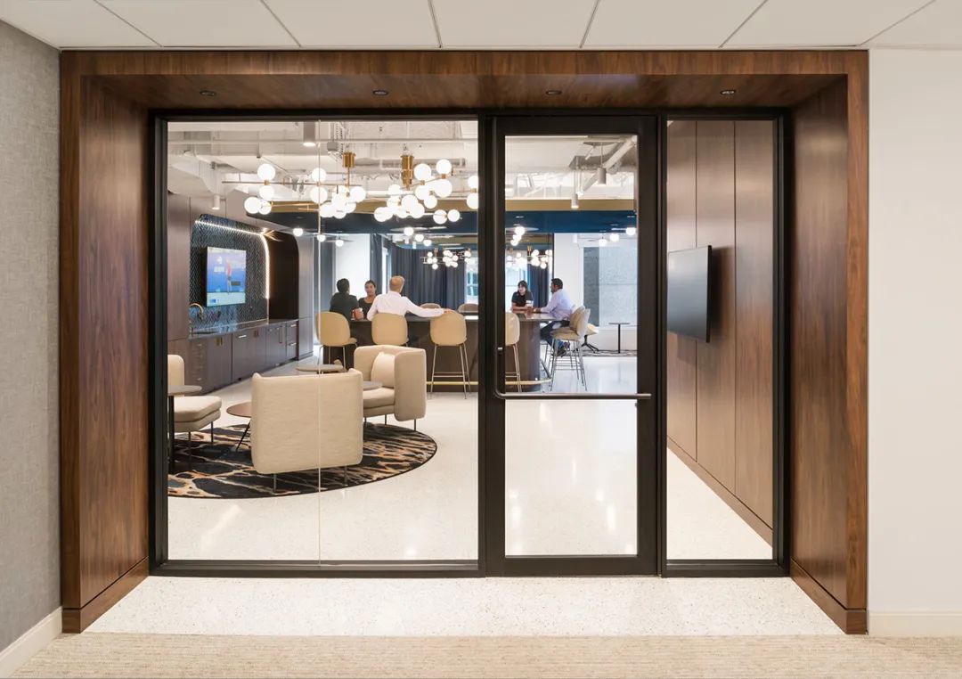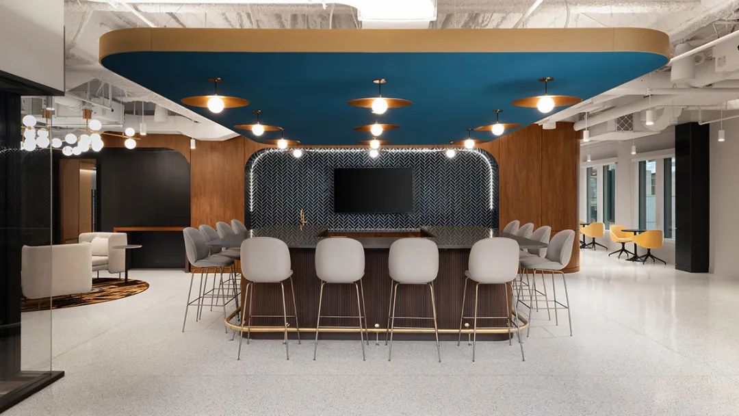 与屋顶露台相连的室内休闲酒吧空间通过折叠玻璃门将露台的美景尽收眼底,完美实现室内外空间的无缝融合。这处室内酒吧的设计即奢华又不失工业质感,其设计风格一直延伸至近旁的多边形休息室,这里配备了各类舒适的沙发、休闲椅以及柔软的地毯,员工可以在这里喝喝咖啡、聊聊天、享受惬意的休闲时光。以玻璃隔墙围合的会议室为培训和员工会议提供了理想的环境。