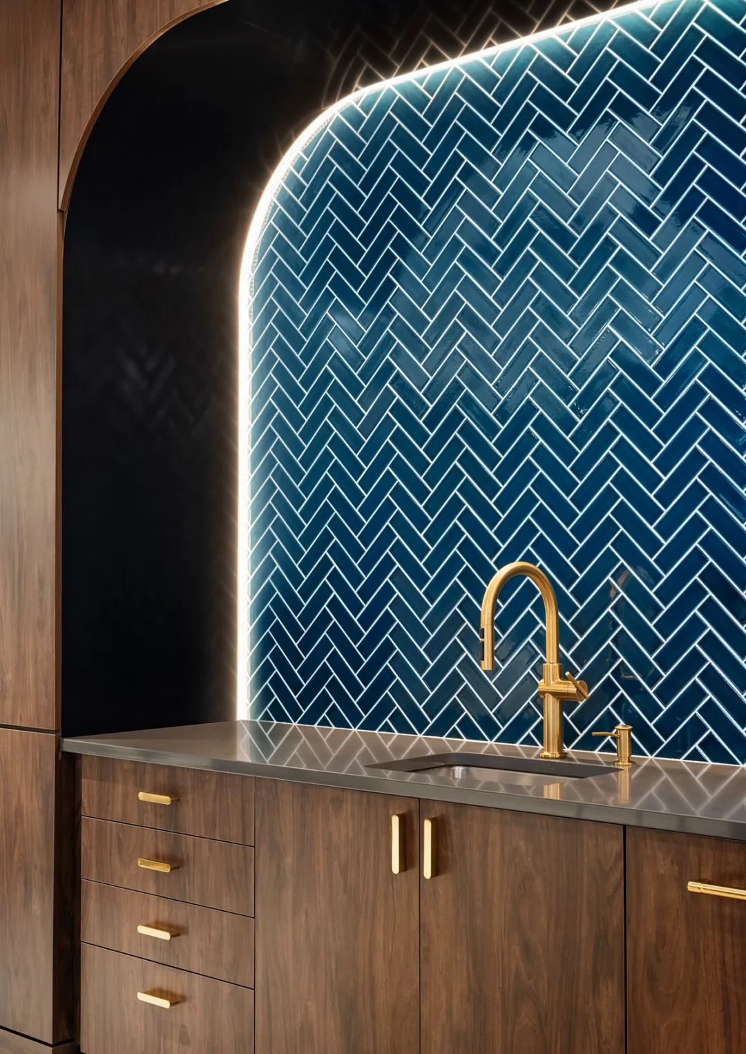 为了向建筑外观上的装饰艺术风格的楔形图案致敬,设计团队在新月区设计了一道引人注目的特色背景墙。这道装饰墙由四面蚀刻有图形的金属板组成,每块金属板上都有不同的V形图案。这些V形图案组合在一起,形成了一个类似于鸟群飞翔的图案。金属板采用背发光构造,可全天候变换颜色以显示时辰变化。此外,这处背景还可以灵活地为节日和其他特殊场合创造独特的灯光效果。
