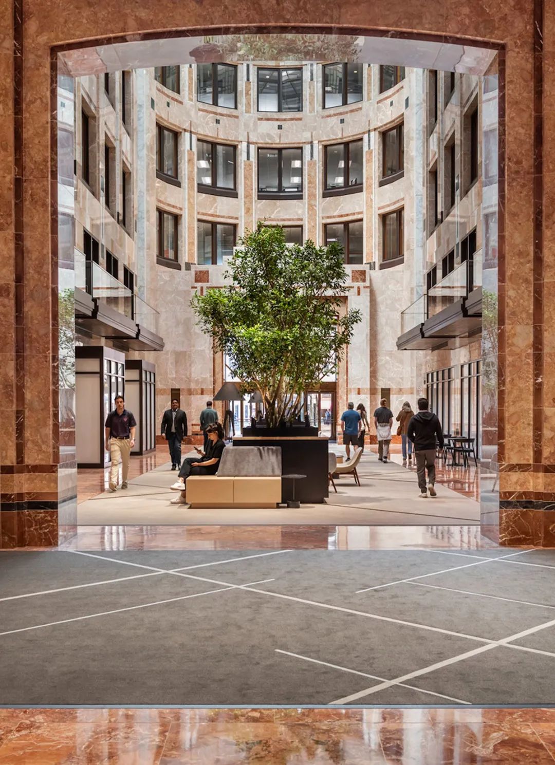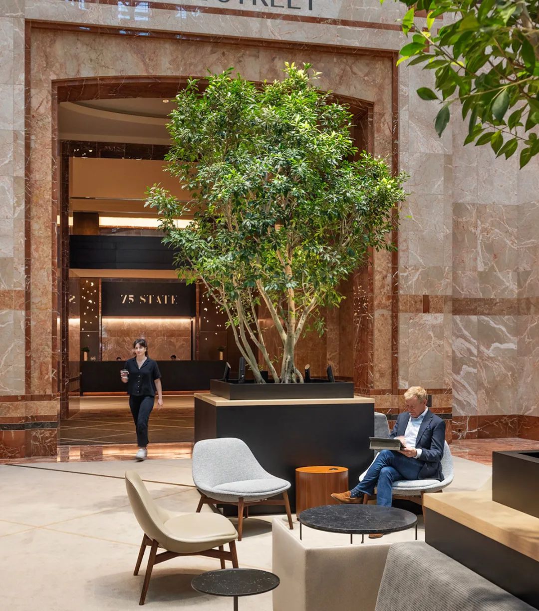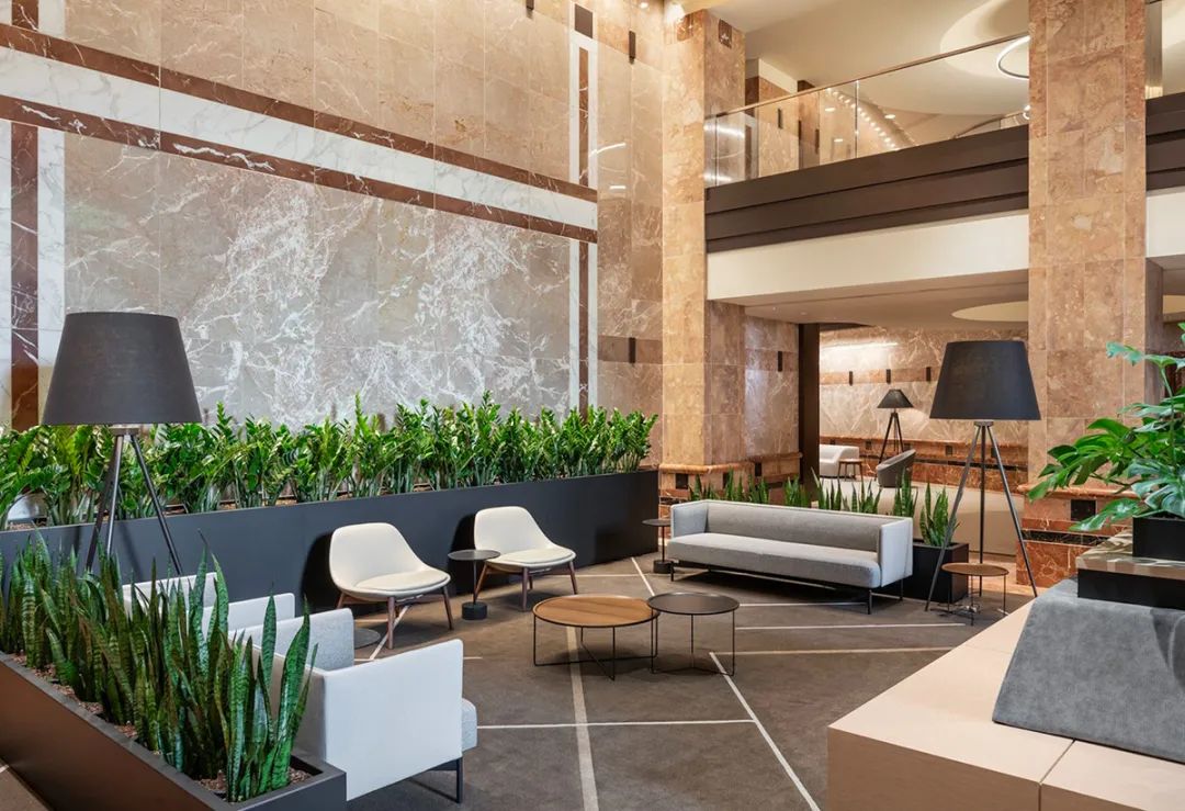 设计团队还对建筑内部现有的超大大厅进行了重新定位设计。通过在设计中融入绿色和亲生物元素,曾经陈旧的大堂如今散发着花园般的时尚气质和宁静氛围。设计团队经过深思熟虑,将大堂划分为三个不同的区域——新月区、花园长廊区和石窟区,并为之匹配各种公共休闲设施,从而让传统的大堂空间焕发生机活力。如今,大堂已成为租户和访客皆喜爱的目的地,人们在此会面、约见或临时办公、短暂停留,空间得到了充分利用。