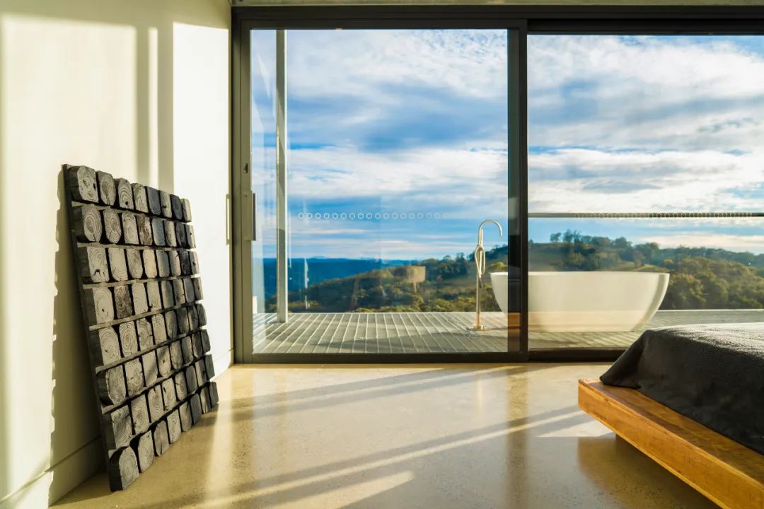 两个度假屋均采用了全景落地窗的开窗方式,将室外的无限制景色引入到了每一个生活空间。每个度假屋均有一个可观赏山景的户外浴缸,在浴缸里看着远山的日落美景,呷着冒着气泡的香槟,那将是多么完美的一天的结束。