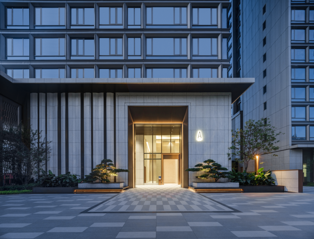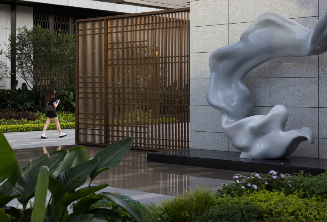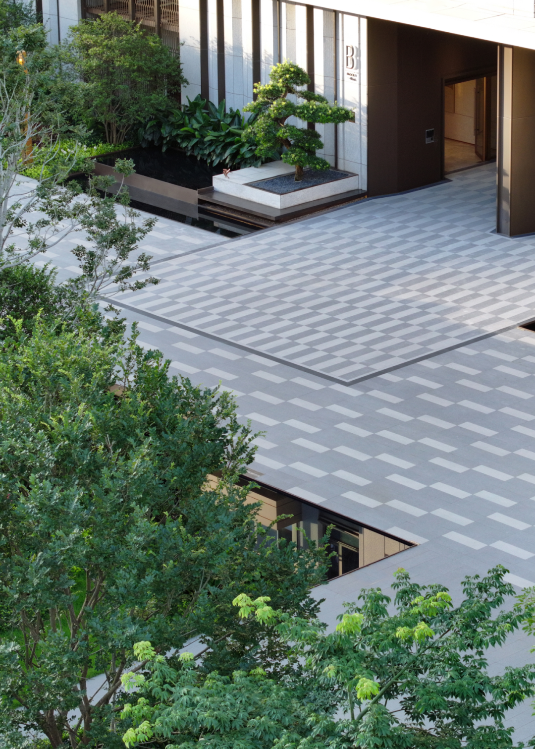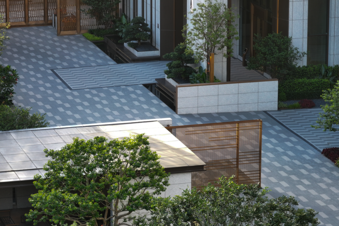 呼应项目建筑中的设计语言,我们将其特色纹样形状进一步简化与提炼,巧妙地融入项目中,进行现代审美与功能性的创新融合。