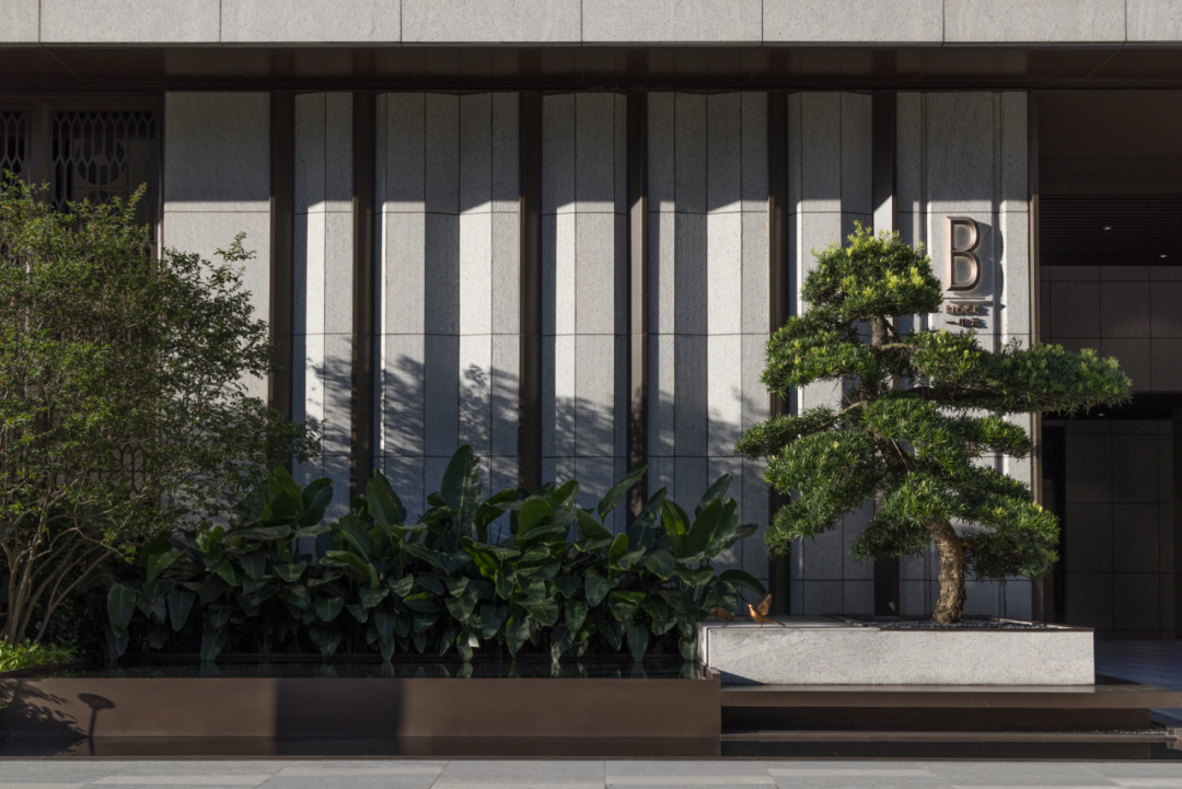 情绪弥漫的同时营造自然放松的诗意氛围。造型别致的罗汉松倒影掩映在层次丰富的叠水面上,酒店式的归家设计提升到达体验,诗意东方的至简大宅由此开启。