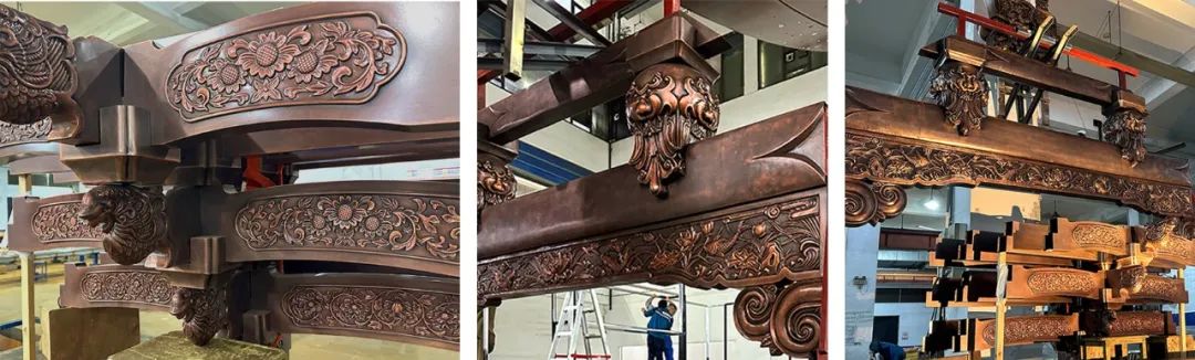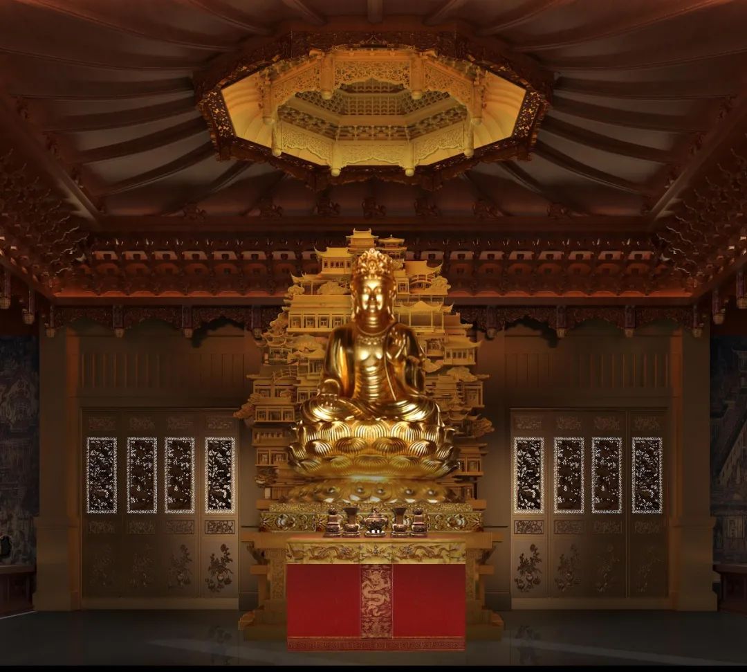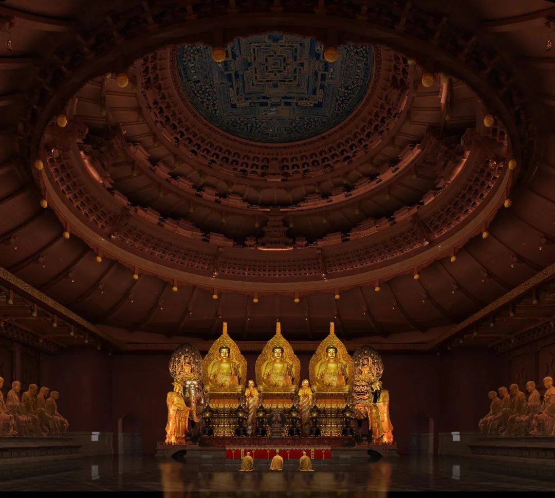 庄严的礼佛场所,如“大雄宝殿、天王殿”所展现的华严美学,兜率内院、天宫、毗卢遮那藏殿等,装饰和空间表现尽显佛教宇宙观之浩瀚华美。