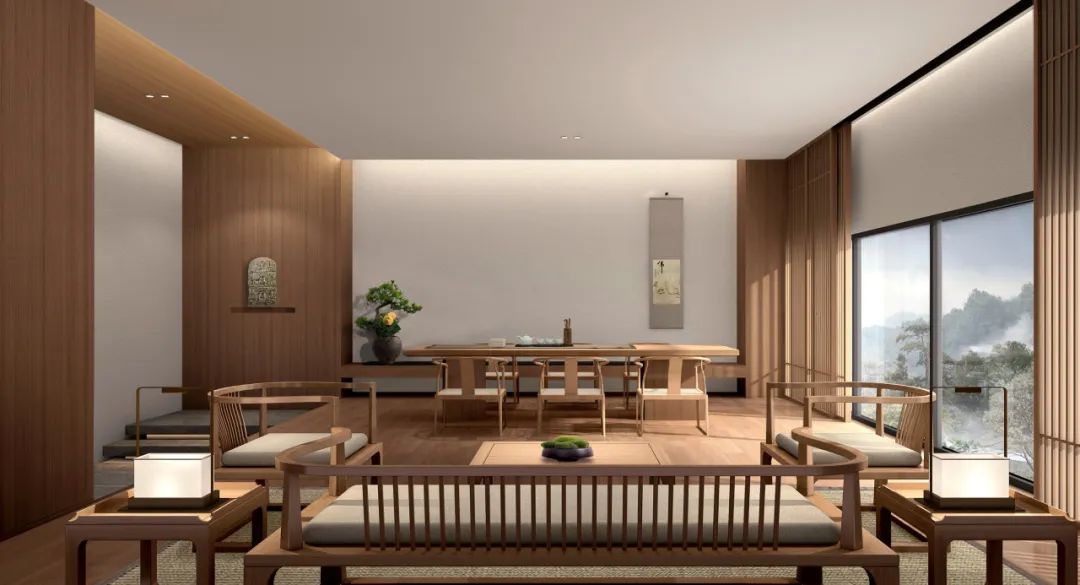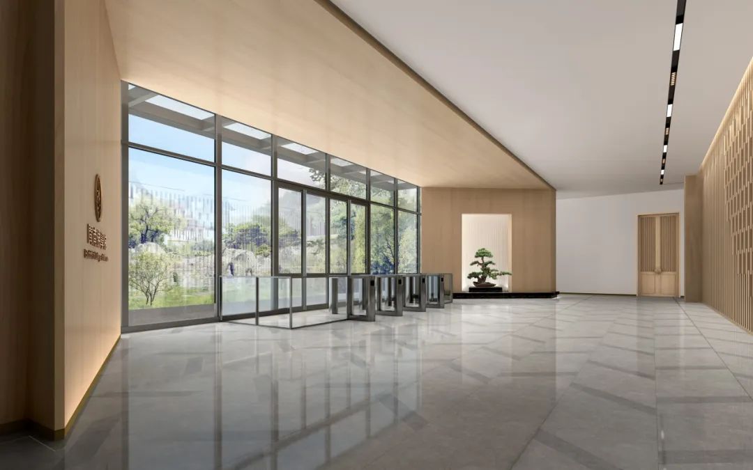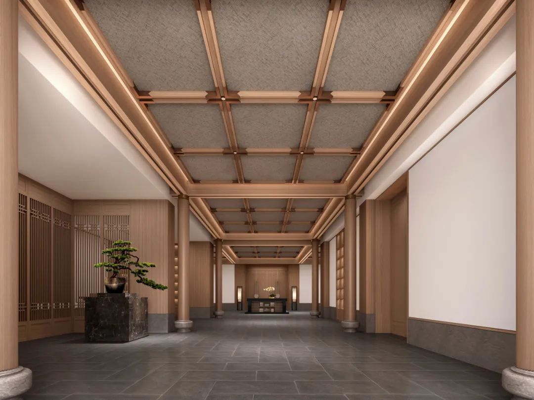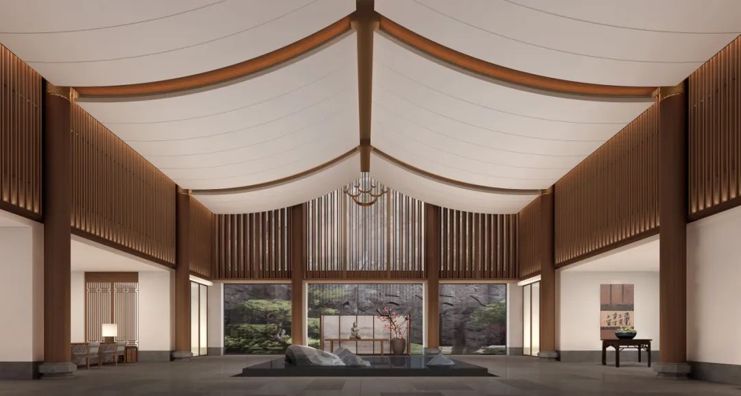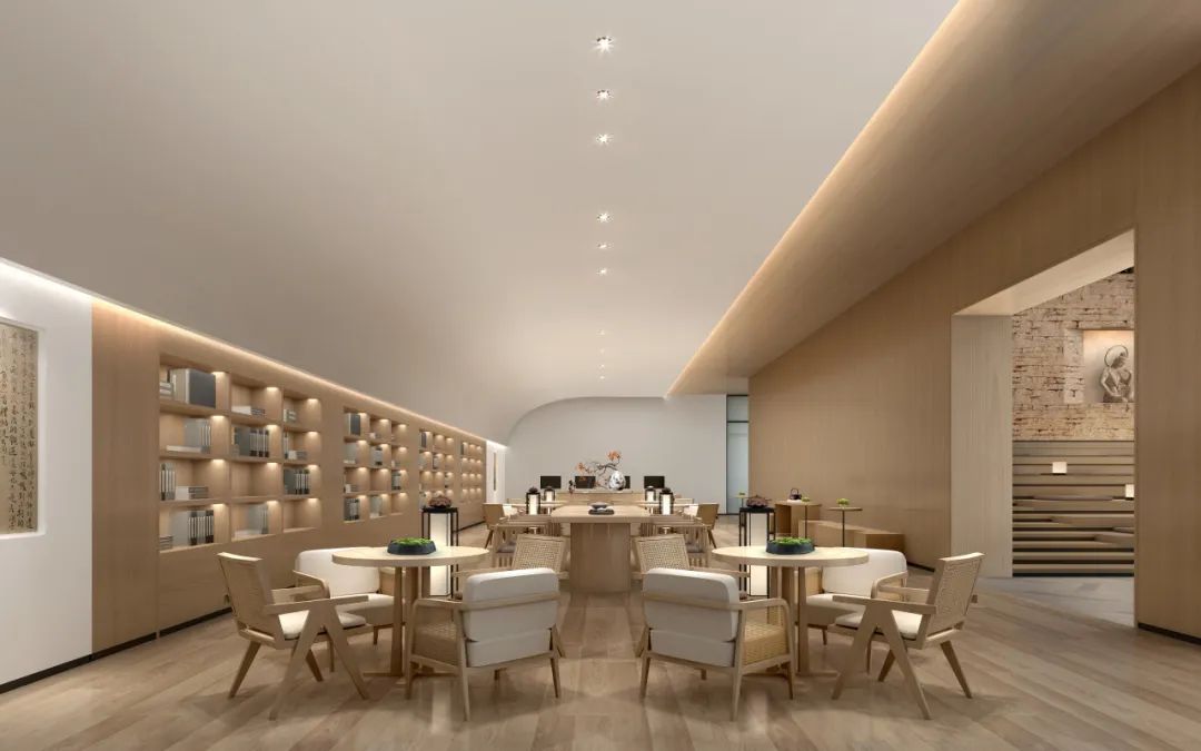 参学会馆大堂空间以传统木格栅元素规整原有建筑空间,二层连续设置的木格栅在建筑端头形成框景,强化外景与室内环境关系。中心静水面是景,是“阿耨达池”的呼应,亦是禅心的源泉。