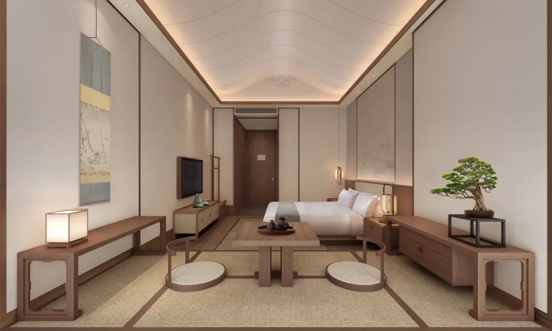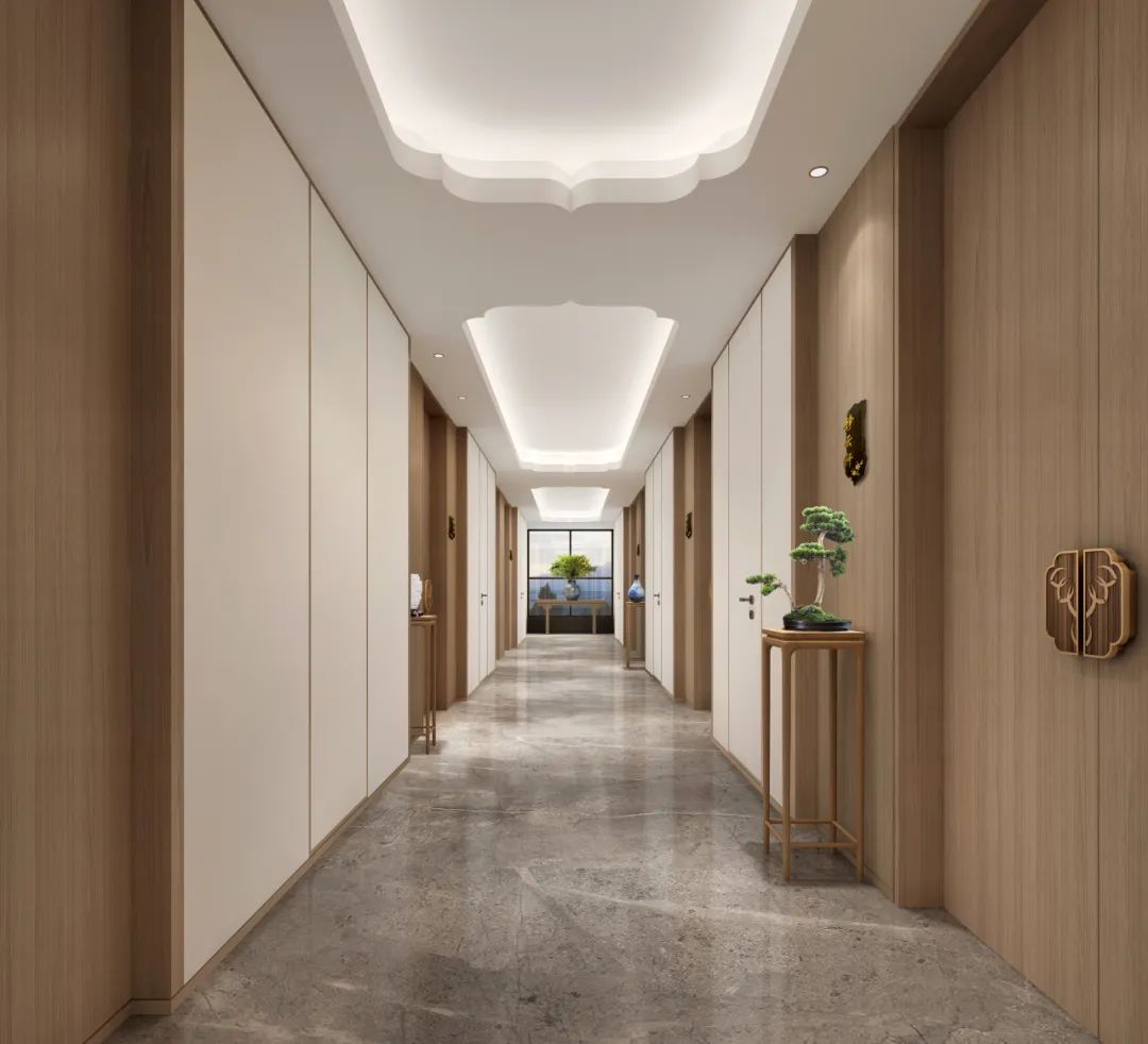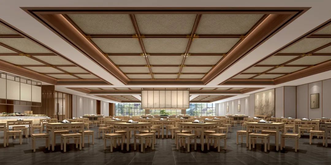 斋堂的墙面造型运用了抽象的闽南传统建筑竖条窗元素,地面运用南普陀寺中局部的莲花元素,整体空间以木色为主基调,左右对称的空间布局是佛法思维的体现,空间规整严谨的布置是僧侣自律严谨性格的展现。