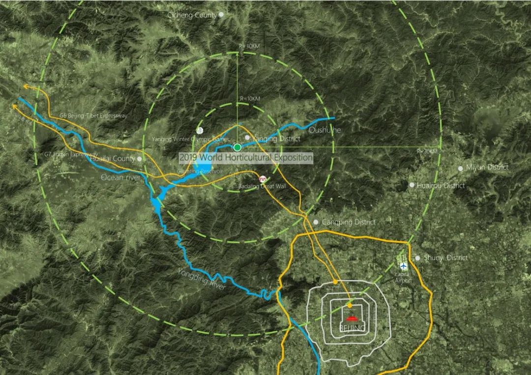 the World Horticultural Exposition at the foot of the Great Wall2019中国北京世界园艺博览会选址,位于延庆区西南部,距离八达岭长城和海坨山约10公里。又称“长城脚下的世园会”。