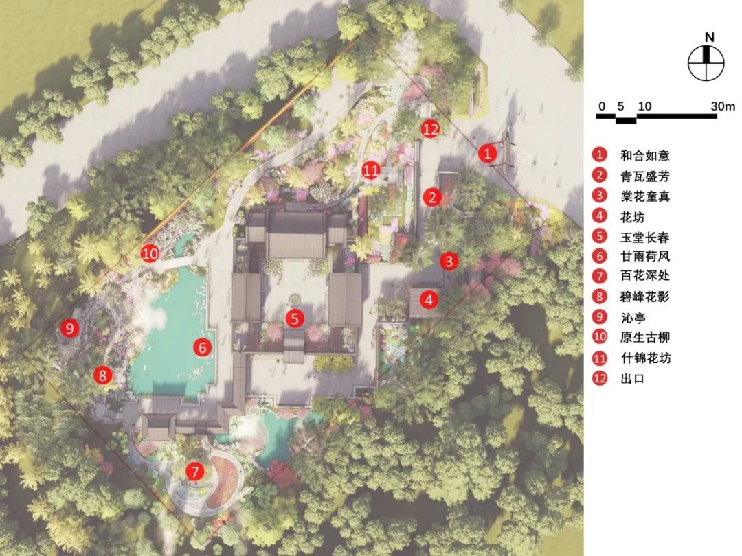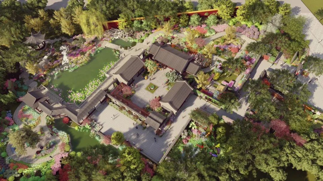“棠花童真”借用园林“框景”手法,以漏窗呈现出一座烂漫的童真花园。透过院墙的花窗,老北京人的生活场景映入眼帘:滚铁环、跳房子,扑蜻蜓...艺术家和园艺师联合创作的一座座充满童趣的“立体花雕”栩栩如生,欣赏这张“棠花童真”的“”照片”,就好像回到了小时候,时而盘旋的鸽哨能令你感受老北京人的童年生活,感知老北京的文化记忆。“玉堂长春”为北京四合院中的典型景观。院子规制齐整,正房三间四耳,厢房三间。正房前栽植一对玉兰,南侧栽植一对西府海棠,抄手游廊下摆放月季盆栽,取“玉堂长春”之美。院落中央的鱼缸被“改造”,成为“海绵院子”的水循环利用系统的中枢。“甘雨荷风”以什刹海为蓝本,呈现“乐山乐水”的优美画卷。水面690平方米,总容量1035立方米,型似蝙蝠,取“纳福”之意。水中种植荷花、睡莲、水葱、千屈菜等挺水、浮水和沉水植物。锦鲤、金鱼漫游其中,形成功能完备的小微湿地景观。敞轩南侧,还藏着一处闹中取静的“园中园”,取名自北京最美丽的胡同“百花深处”。高耸的白皮松与造型元宝枫相互辉映;牡丹、芍药、月季等传统名花,以及萱草、玉簪、鸢尾等近现代名花竞展芳容,共同再现“百花深处”的赏花盛景。同时也营造了北京人晨起遛鸟、舒展筋骨、拉弦吊嗓的悠然生活场景。这里是百姓的乐园,更是文脉兴盛之地。