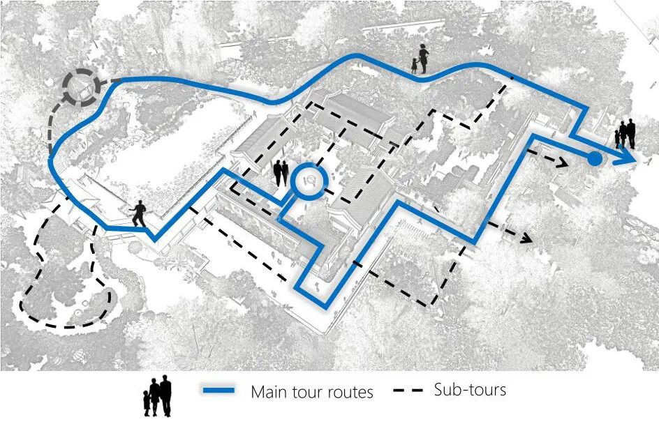 项目位于中华园艺展区,华北组团之首,东临公共空间,与上海园相望,西临天津园,南临河北园,北侧靠近东入口(遥望中国馆),与园艺生活体验带相连。2019年北京世园局规划北京室外展园,地块长96米,宽56米占地,5350平方米。02 / 布局