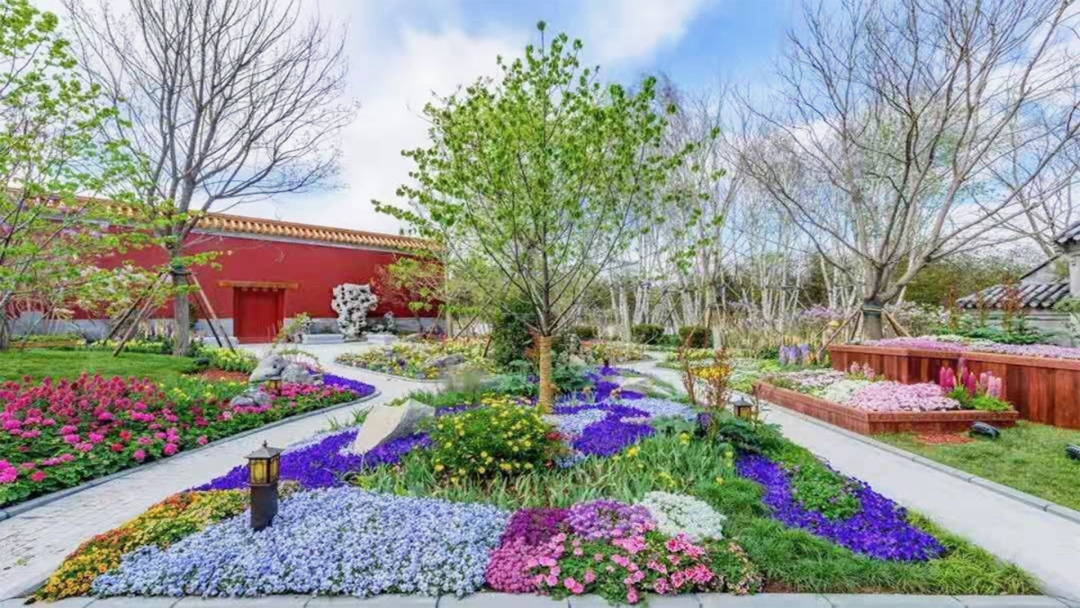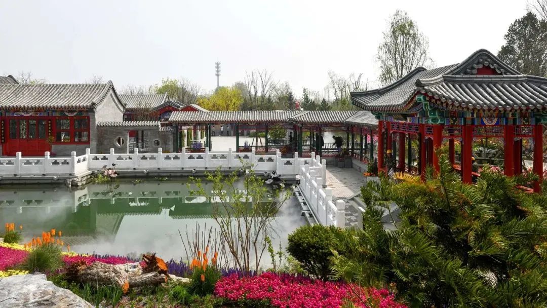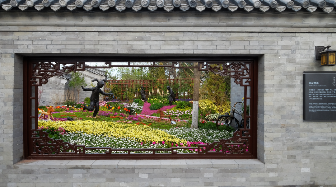 古色古香的北京园牌楼,匾额背面雕刻着“和合如意”,构成北京园的迎宾景观。牌楼两侧分布着从北京民居中提取的片片山墙为景墙,配植高低错落的宿根花卉和应季草花,特别选取月季等红色调花材,代表北京人喜迎四方宾朋的喜悦心情。“青瓦盛芳”以胡同为载体展示北京的园艺风采。沿山墙步入“槐树胡同”,脚下青砖墁地,头顶国槐繁茂,偶有杏树两棵,枝头杏花白里透红。一扇扇漆红院门,或敞开或虚掩。春风一阵,槐花香,杏花雨,墙角的紫茉莉、牵牛花仿佛点头示意,呈现一派“青瓦盛芳”的欢愉。