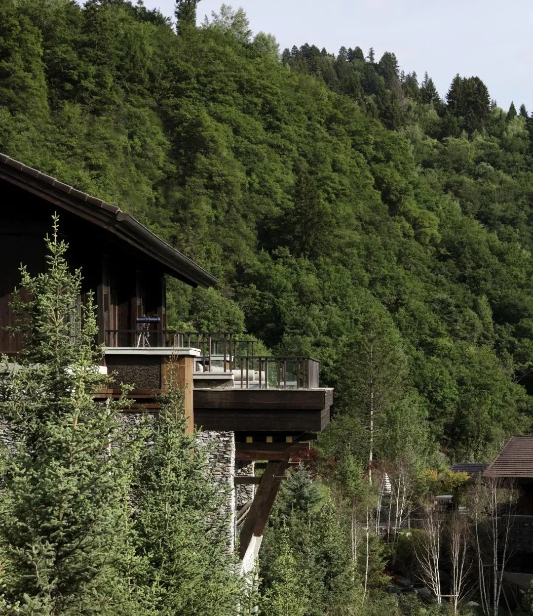 “我们精心处理主要建筑的布局和朝向,以利用和框出远处的景观。大堂的主窗/露台正对山谷尽头的雪峰,而中央区域的大部分窗户则聚焦于山谷对面的原生村落,营造出一种对话并加强场所感和归属感,”Chiara 介绍道。为了尊重周边环境,建筑的规模和排布经过深思熟虑,看起来就与传统村庄中经年累月的建筑群无异。