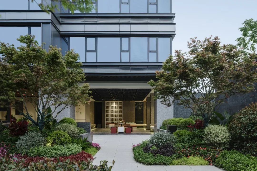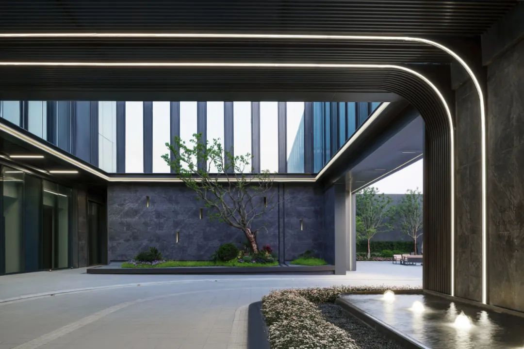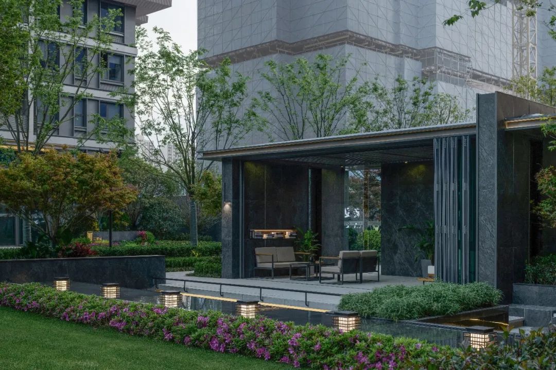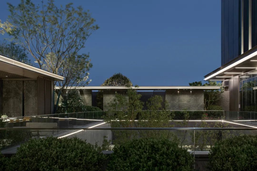 项目之初,景观、建筑与室内三专业紧密配合,在空间尺度、交通组织、材料使用等多方面达成共识。落客区模糊建筑与景观的界面,用极简的线条贯穿雨棚与景墙,归家的仪式感得到延续。采用巧妙手法处理景观连廊与建筑檐口的交接,弱化视觉差异,近观美景赏夜色,远可驻足暂停时光。用空间与时间共同构筑一个美好的自然客厅,迎来送往,空间如画,使业主不出社区而获山林之乐,身居都市而得静谧之趣。