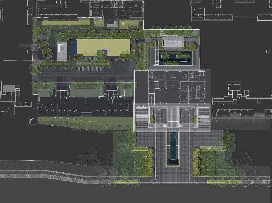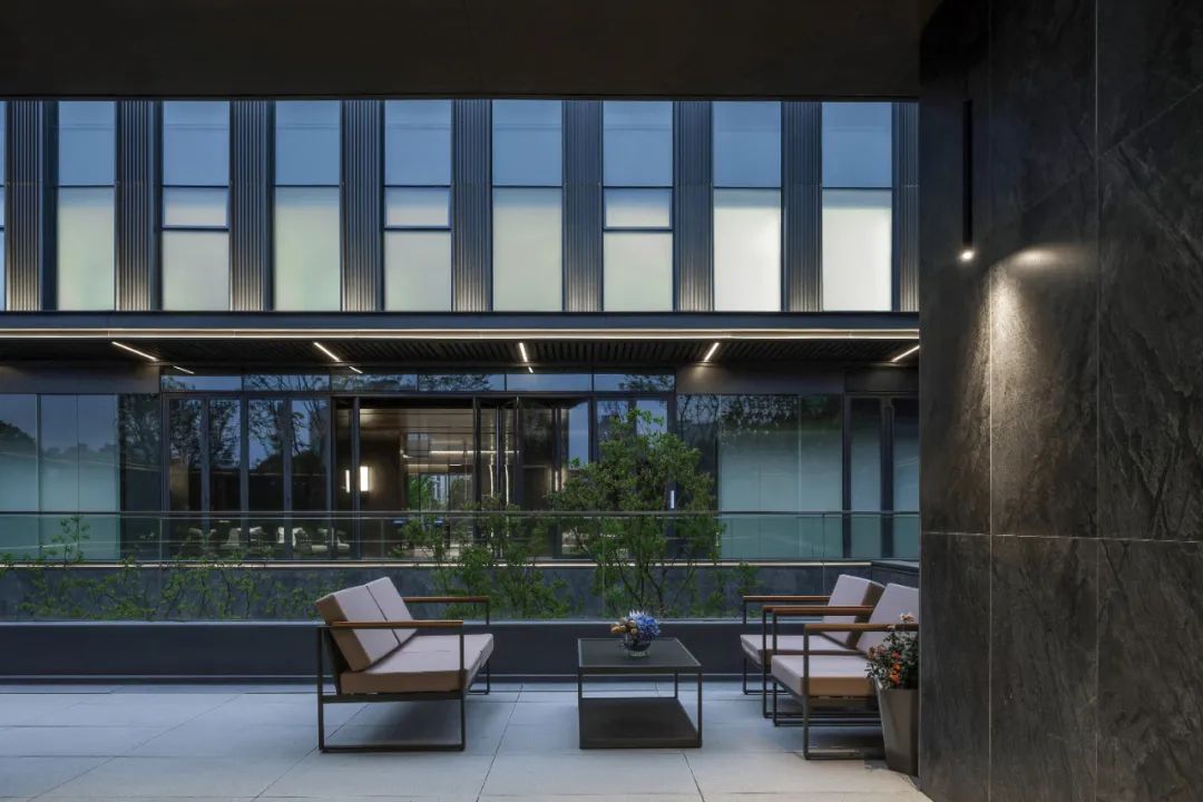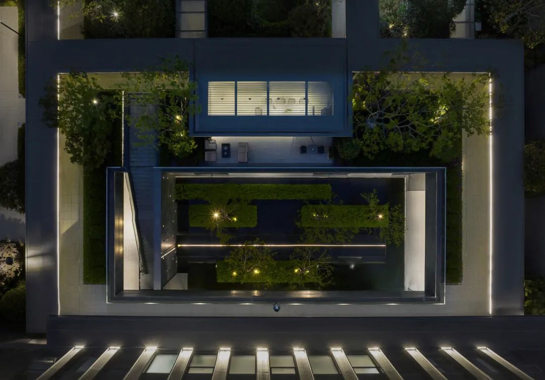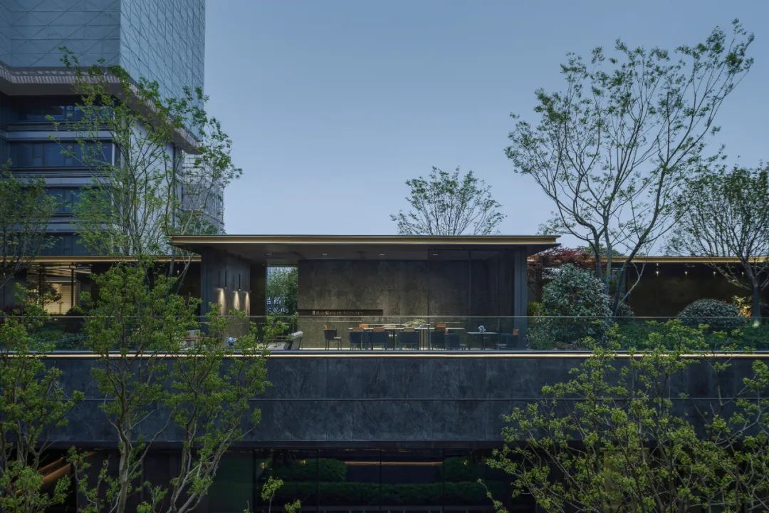项目之初,景观、建筑与室内三专业紧密配合,在空间尺度、交通组织、材料使用等多方面达成共识。落客区模糊建筑与景观的界面,用极简的线条贯穿雨棚与景墙,归家的仪式感得到延续。采用巧妙手法处理景观连廊与建筑檐口的交接,弱化视觉差异,近观美景赏夜色,远可驻足暂停时光。用空间与时间共同构筑一个美好的自然客厅,迎来送往,空间如画,使业主不出社区而获山林之乐,身居都市而得静谧之趣。