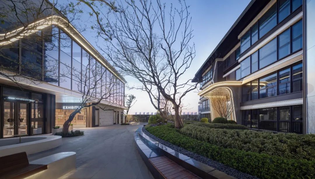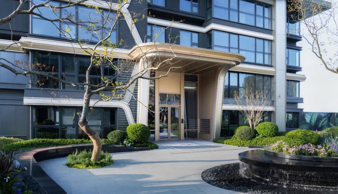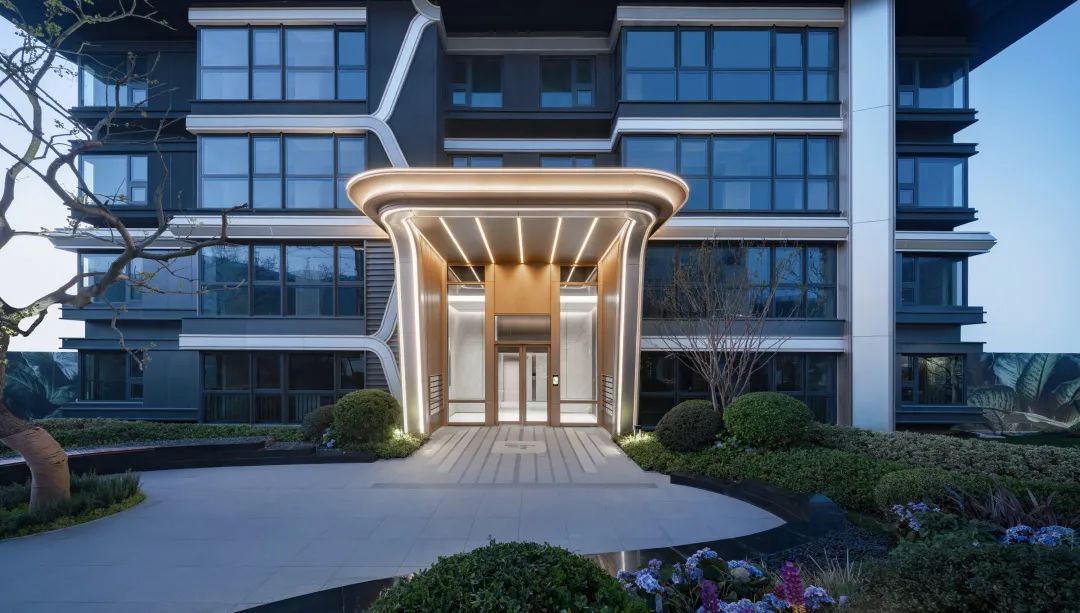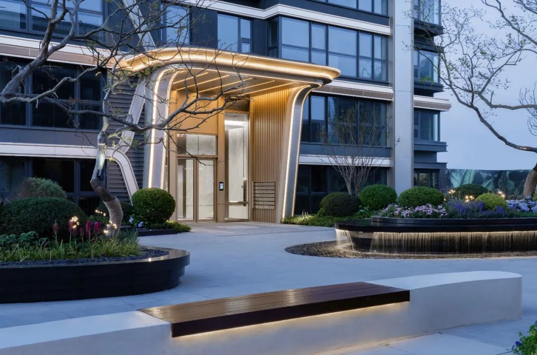 自在大堂:游艇造型的建筑门头给至尚立面以画龙点睛之笔,结合定制化入户铺装、灯光及标识,高辨识度的入户景墙搭配精致的植物组团以及便捷的户外等待区,带来尊荣的入户体验。