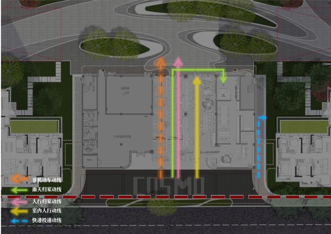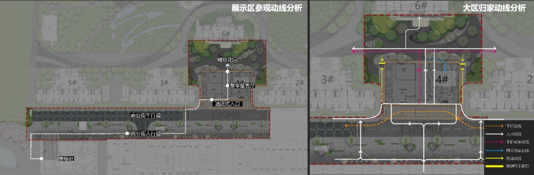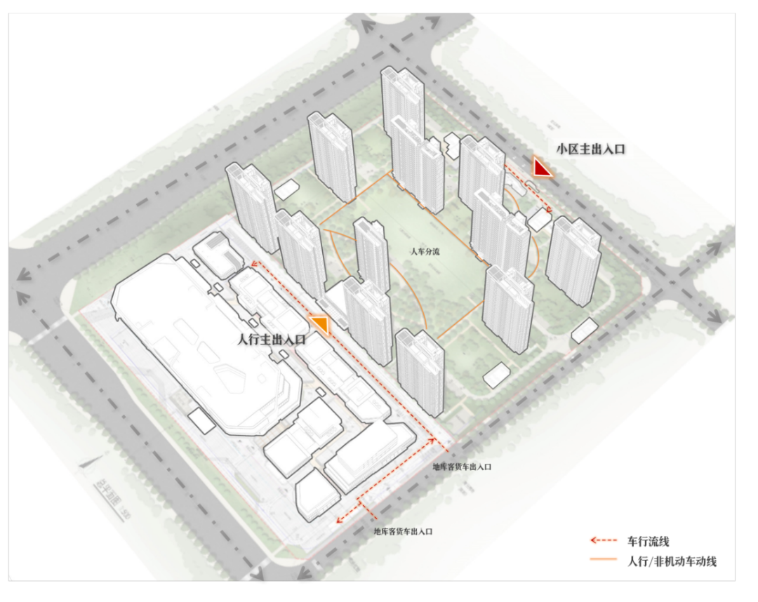 临近城市规划道路龙腾路,作为社区主要的车行出入口兼做人行出入口,业主可通过此出入口驾车进入地下车库到达地库大堂,为业主节省出勤时间。同时在此打造酒店式落客区,带给业主以及访客足够的仪式感和尊崇感。