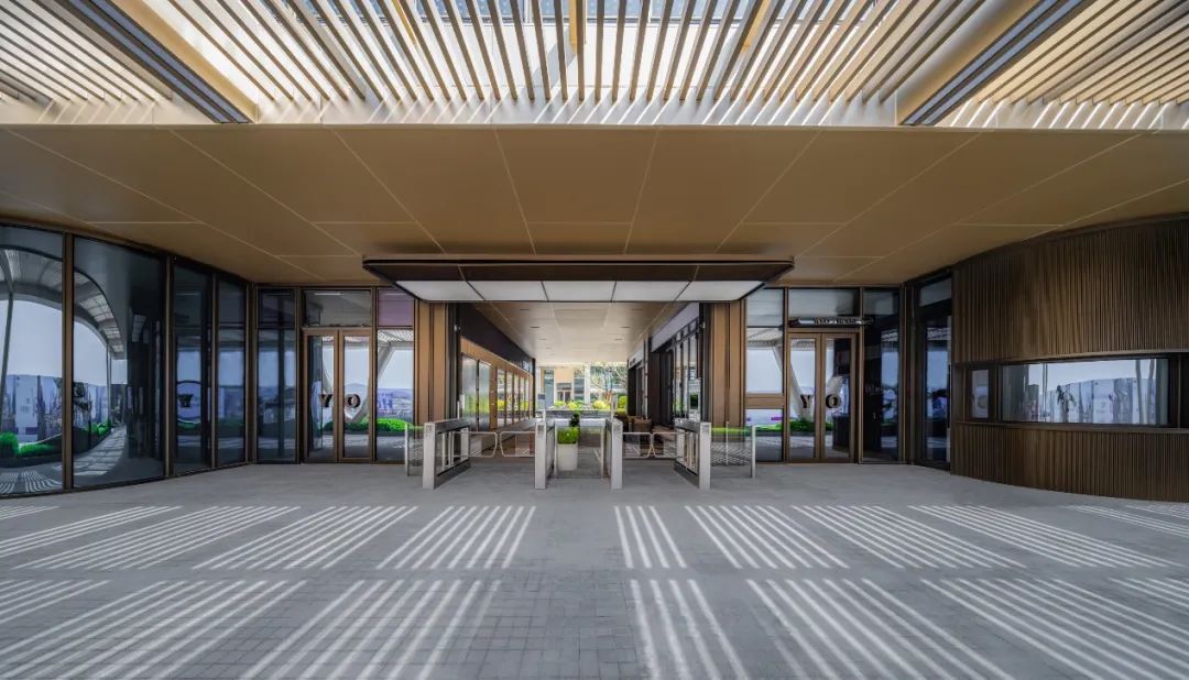 归家大堂利用酒店式落客区,让居者乘车回家时可优雅停驻在廊架下面,实现无雨归家抵达。让居者在归家的这一刻,沉浸身心的舒适和愉悦,为生活充盈自然的从容与舒心。