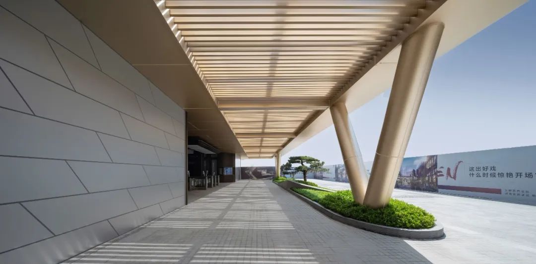 建筑的精美与否在于细部的设计,堂客厅延续了金地至尚的创新风格,应用现代化的材料铝板,将建筑的美融入环境和创新概念。随着太阳、月光和灯光的变化,香槟色格栅的光影映在银白色铝板上,通透明亮、灵动美观,给精致的入口带来了动态的美。