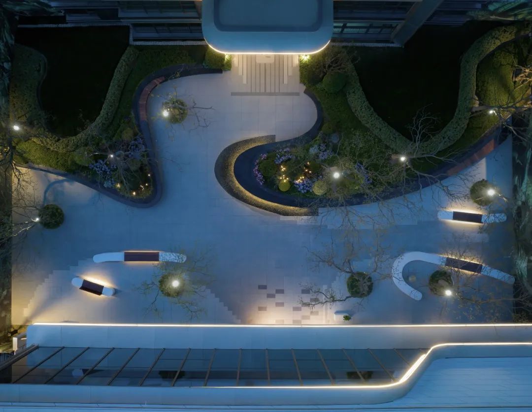 从堂客厅连廊出来到入户门头之间的步道采用曲线型流线,增加业主在精致的景观中的停留时间,为业主的归家增添了一份趣味性。同时,规划的道路设计与立面的曲线性和流线感相呼应,与造型设计达成统一。