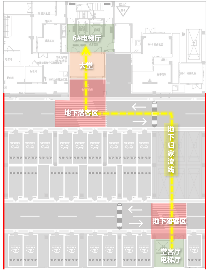 堂客厅地下大堂至6号楼地下大堂地下归家流线示意图,以实际交付为准