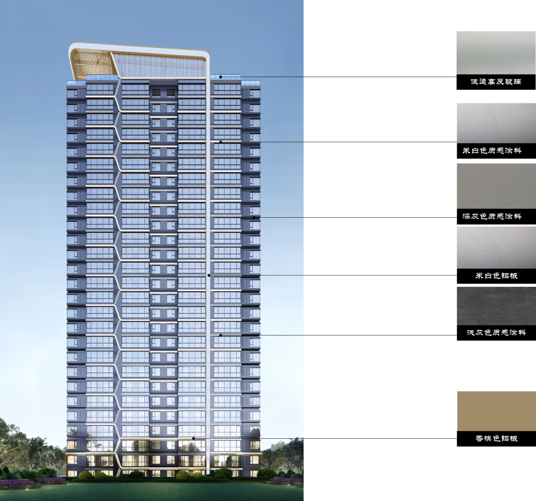 材质运用:沉稳典雅的色彩搭配彰显品质和现代感,色彩典雅的铝板与真石漆的结合,彰显年轻精致的至尚美学。