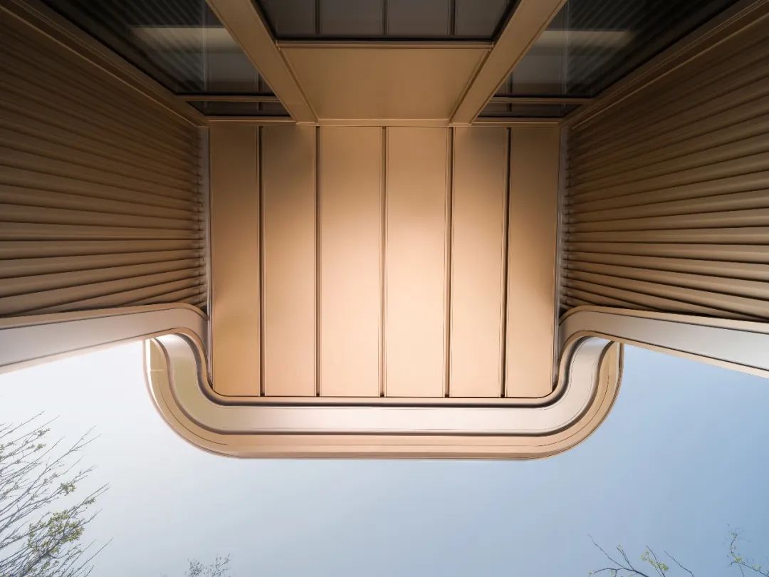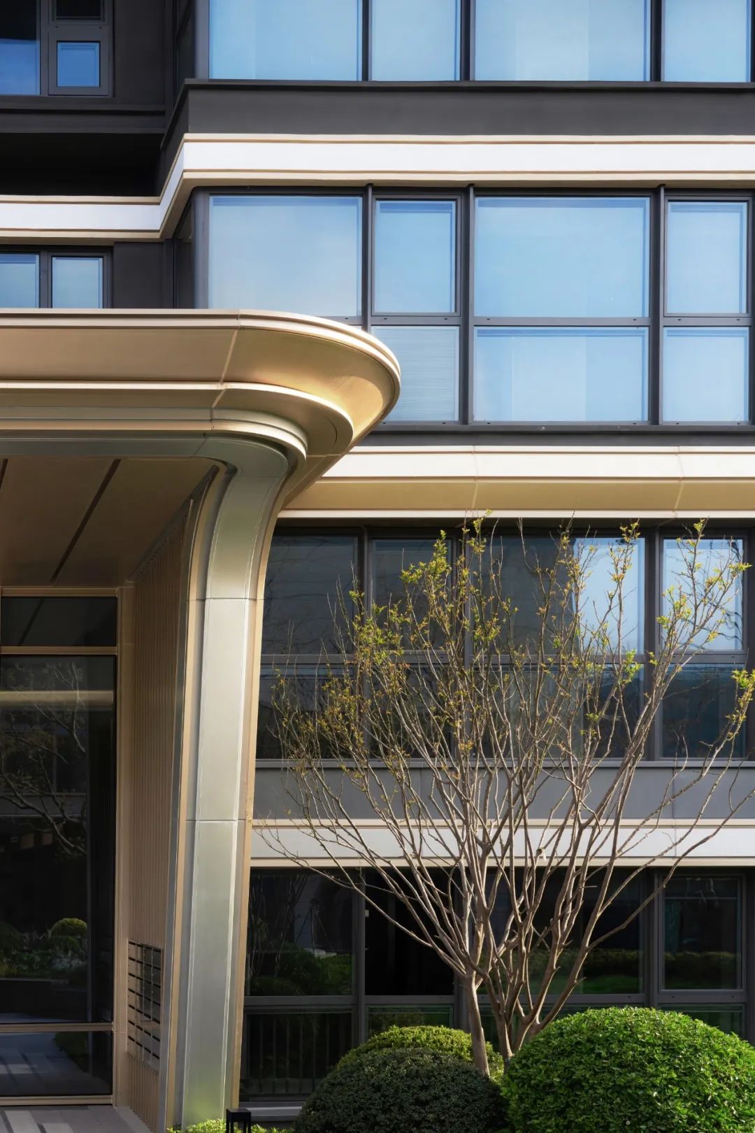 经典而有流行感的建筑气质,以深灰色质感涂料为主,香槟金色、米白色质感涂料弧形线条加以点缀,近人基座部分及屋顶构架塔冠采用香槟金铝板线条,通过高辨识度色彩搭配,和现代感材质相配合,诠释了价值感与昭示性。