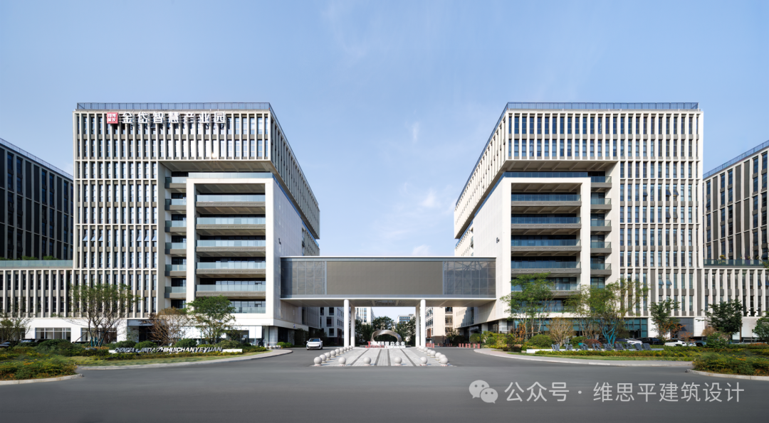 维思平团队充分考虑城市的发展及园区后续的商务属性延伸的问题,园区整体采取简约大方的建筑风格,以灰白主色调塑造高端商务的品牌形象,在智云谷科技廊道设置数字窗口,打造城市之门,智慧生态双塔。