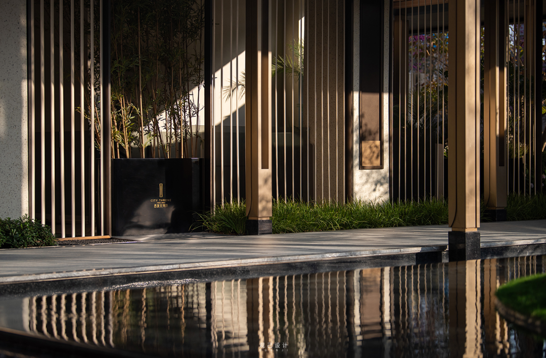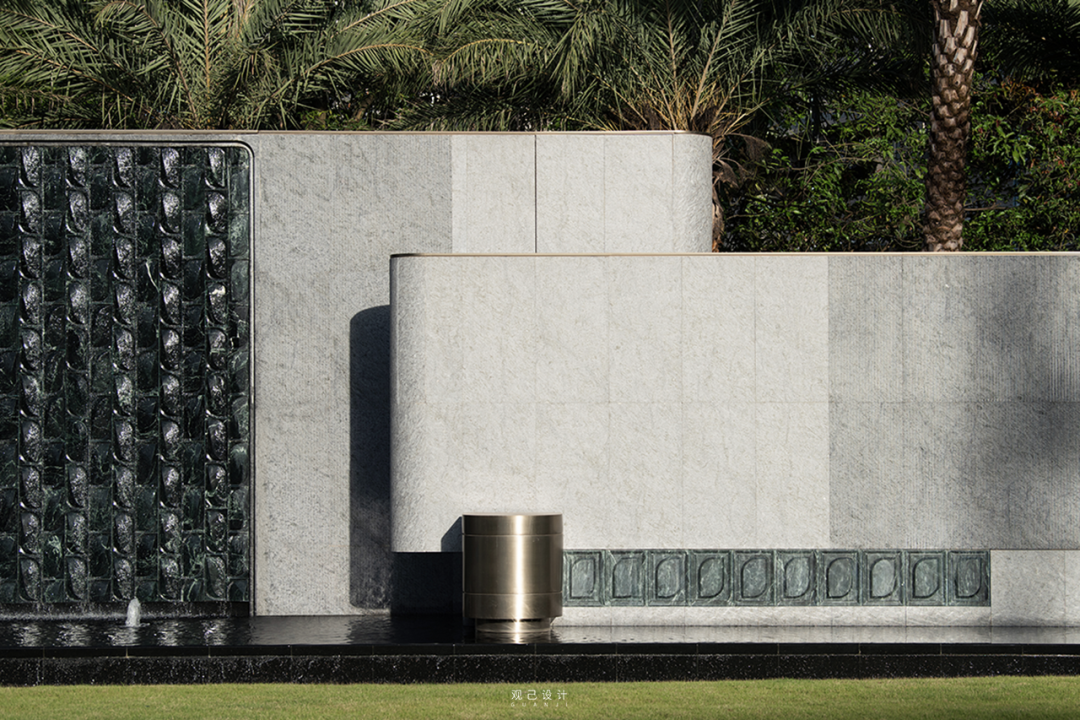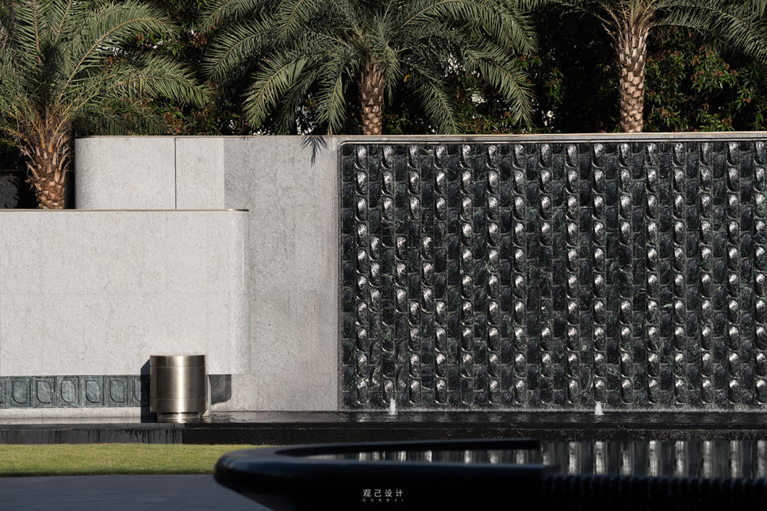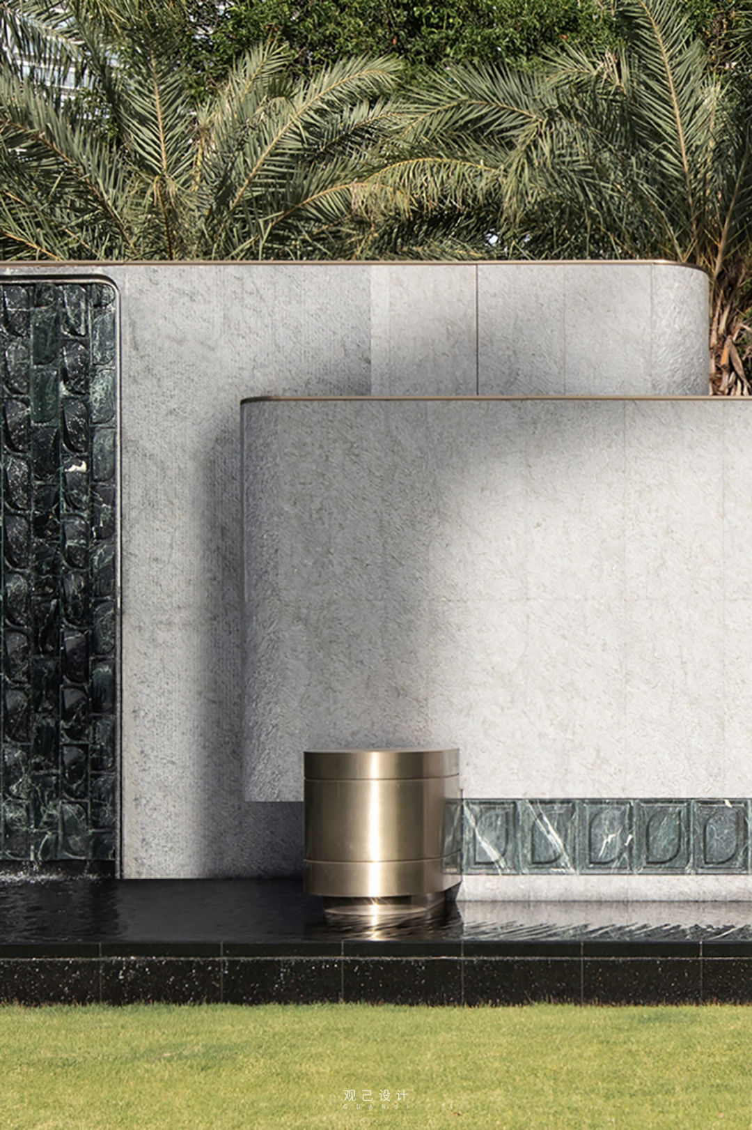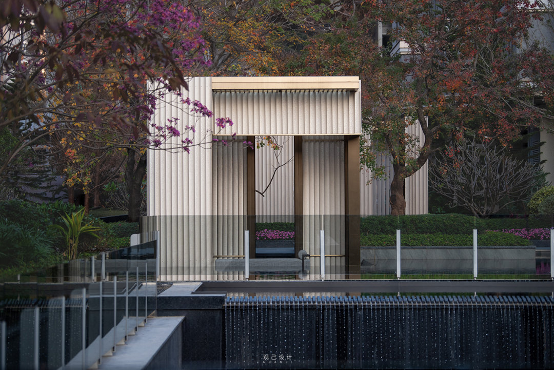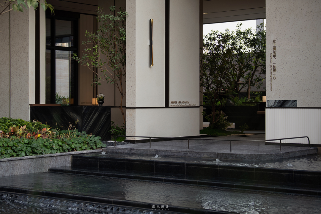 珠水宛折元素,弧形水景与曲面景墙的肌理,给人由内而外的平静感,以它独有的温柔,勾勒出一道道静谧的涟漪。