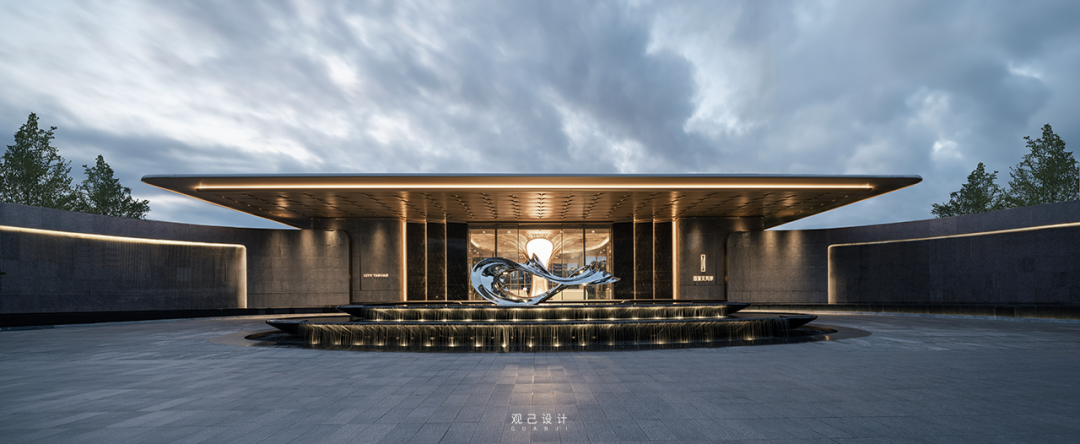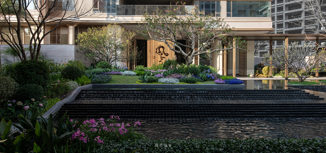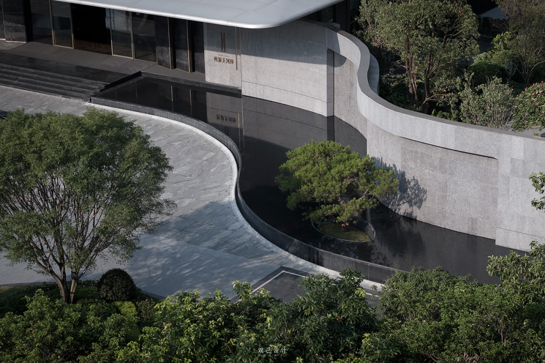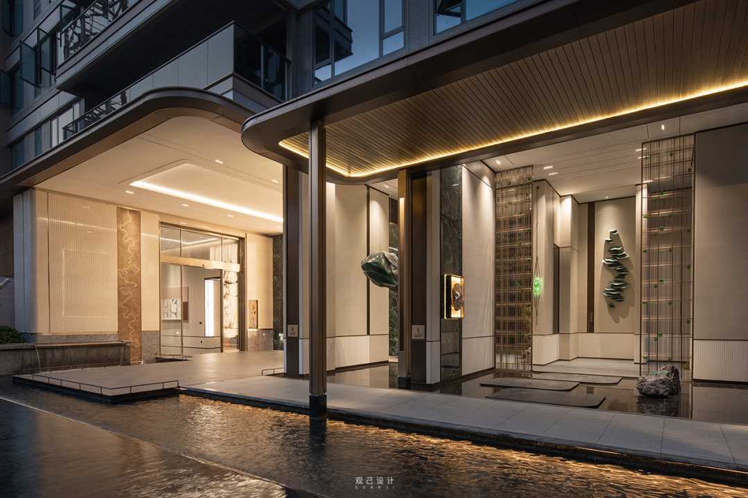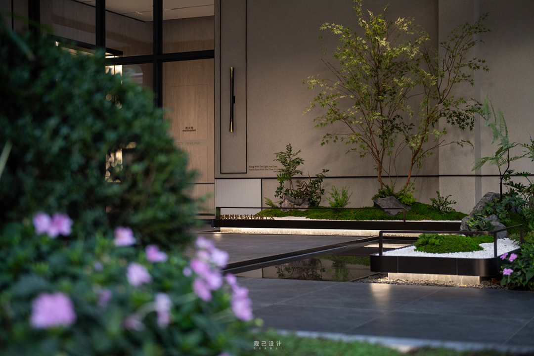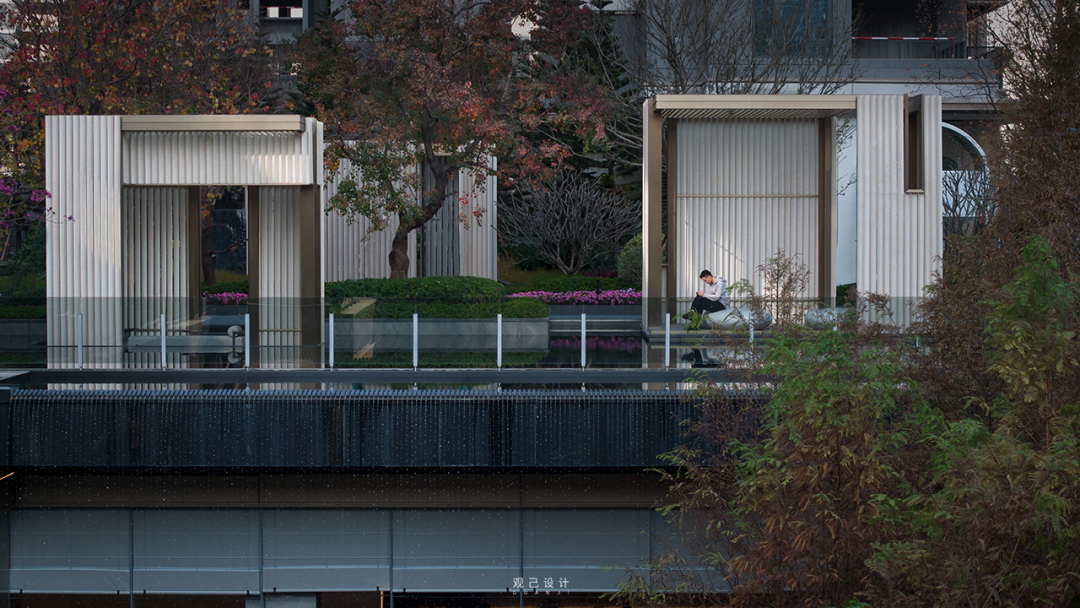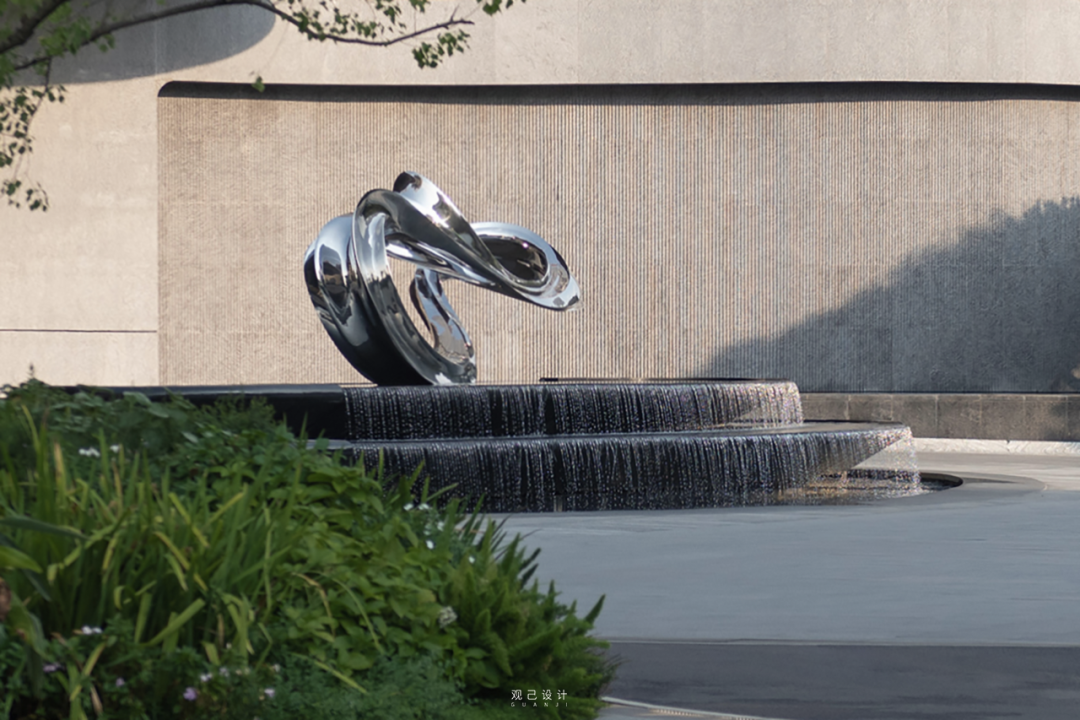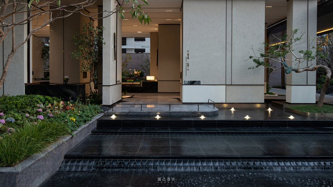 珠水宛折元素,弧形水景与曲面景墙的肌理,给人由内而外的平静感,以它独有的温柔,勾勒出一道道静谧的涟漪。