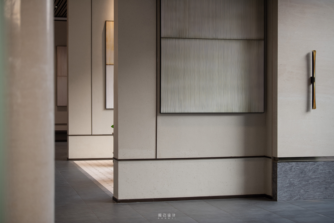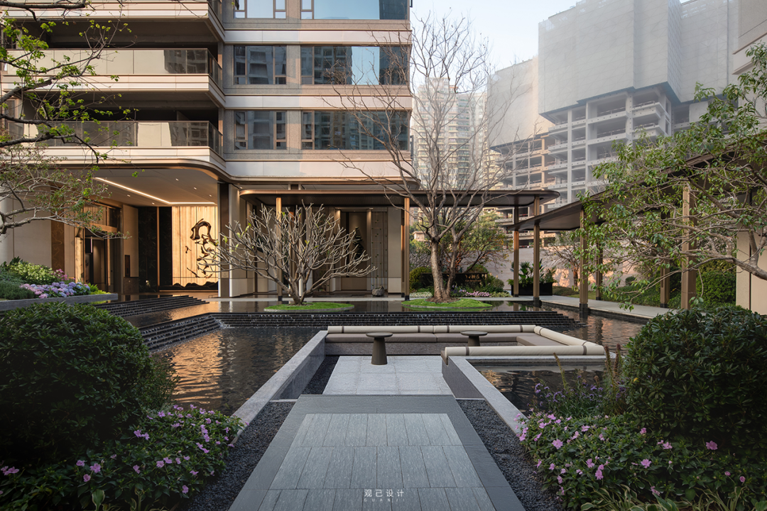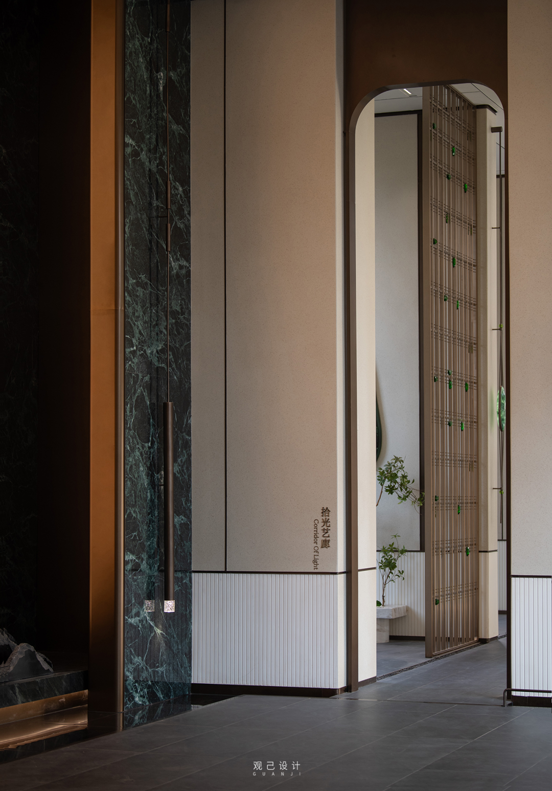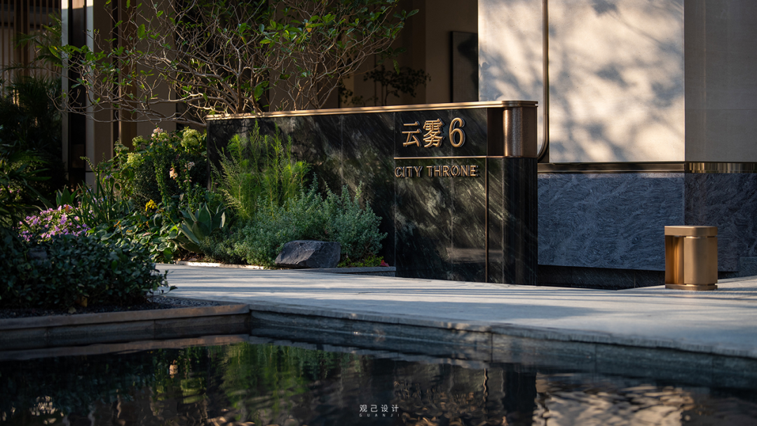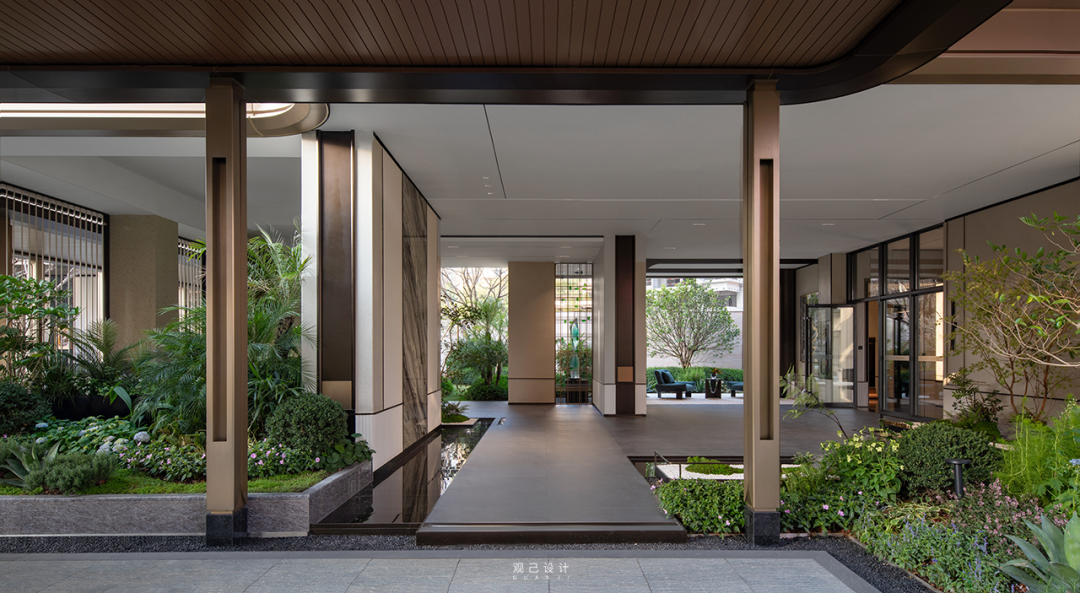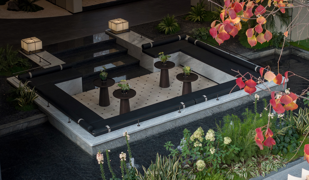 珠水宛折元素,弧形水景与曲面景墙的肌理,给人由内而外的平静感,以它独有的温柔,勾勒出一道道静谧的涟漪。