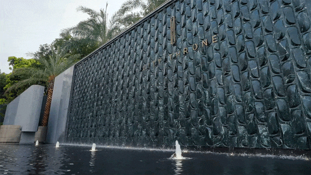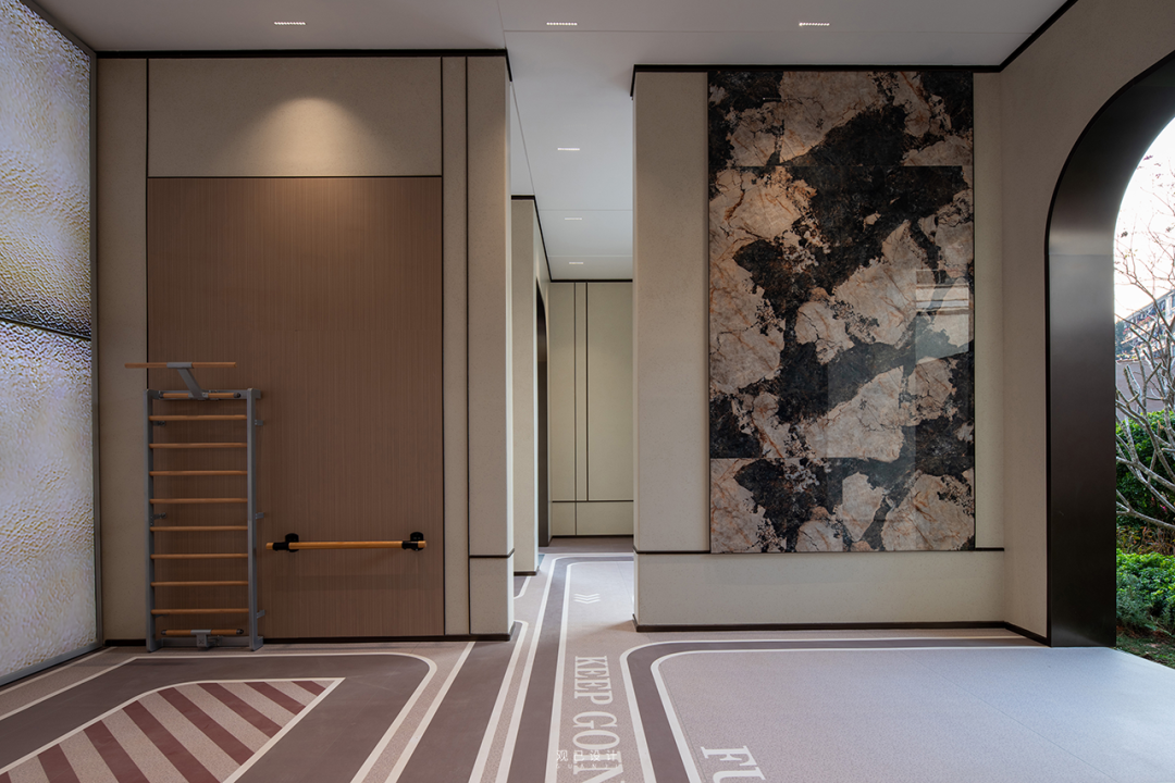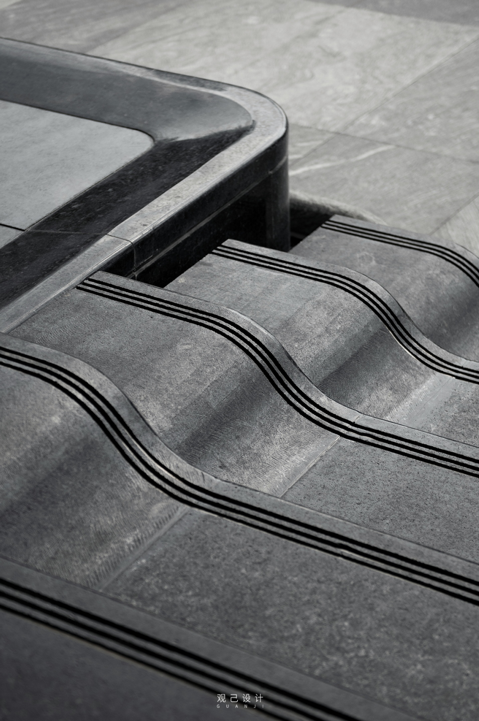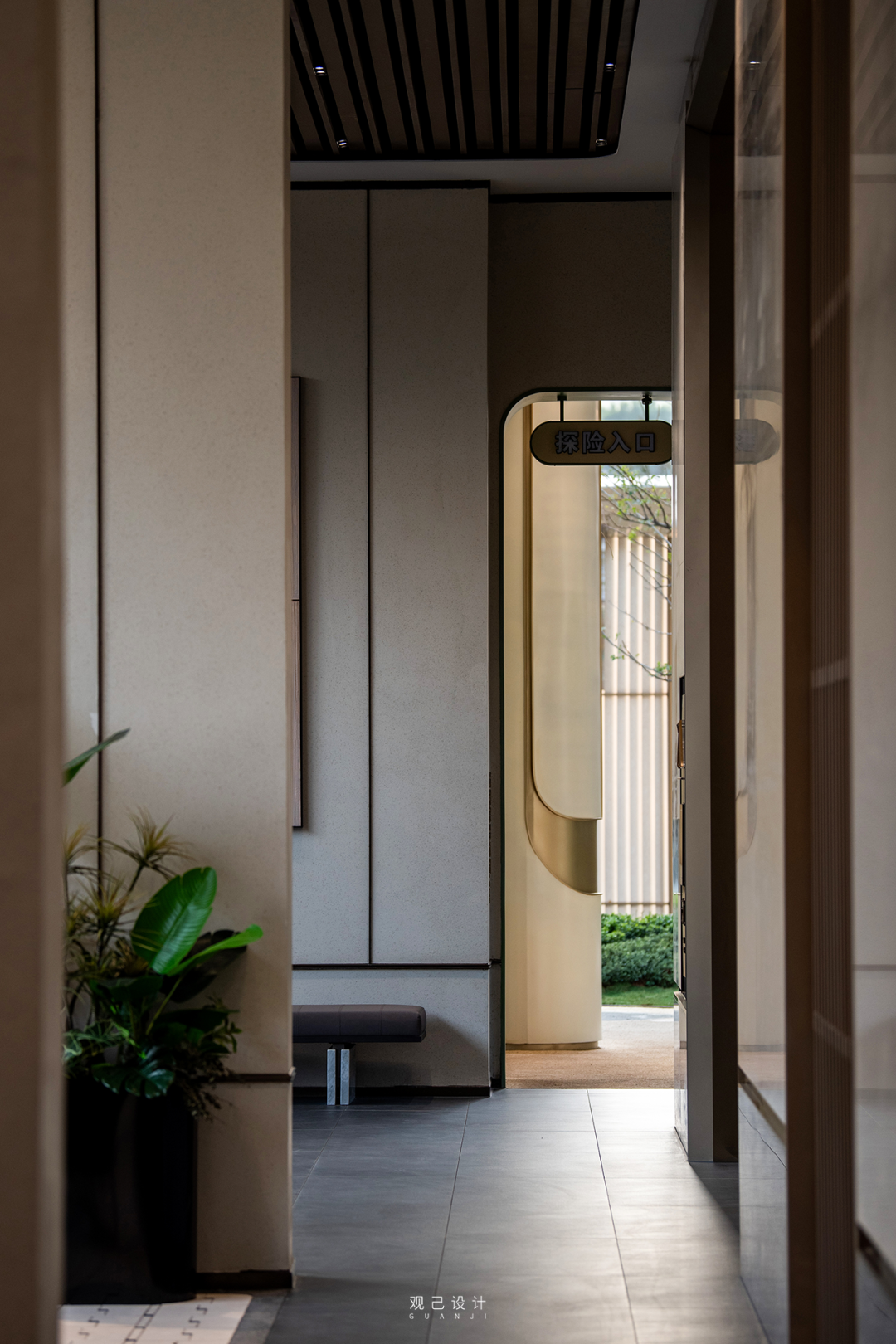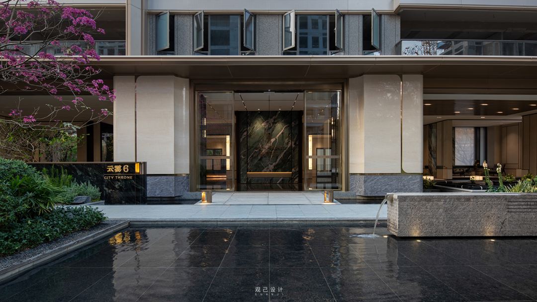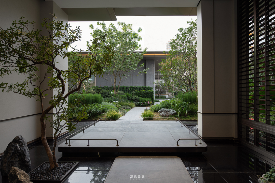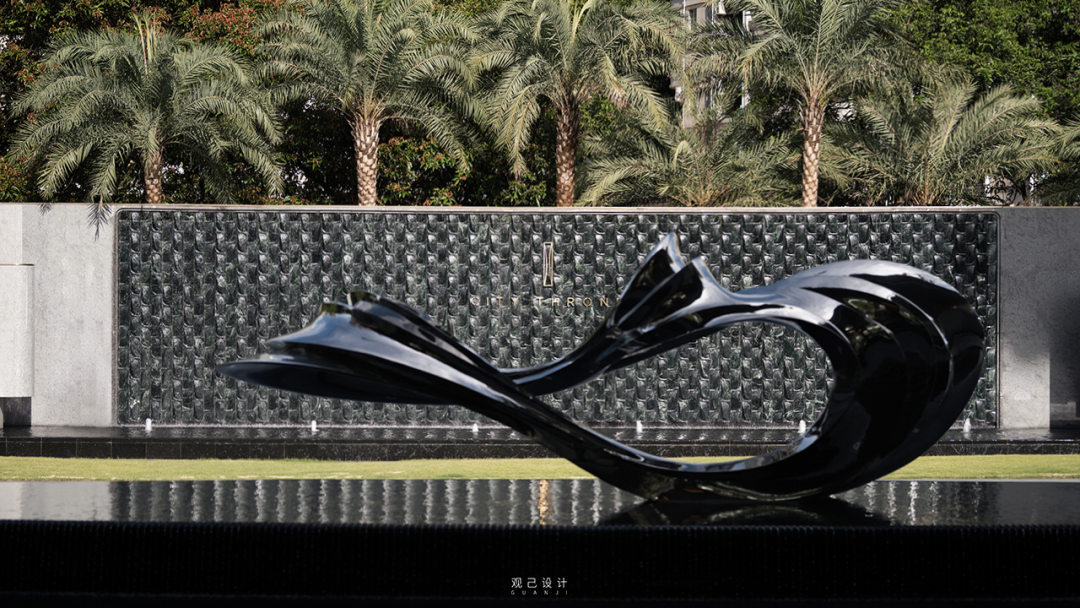 珠水宛折元素,弧形水景与曲面景墙的肌理,给人由内而外的平静感,以它独有的温柔,勾勒出一道道静谧的涟漪。