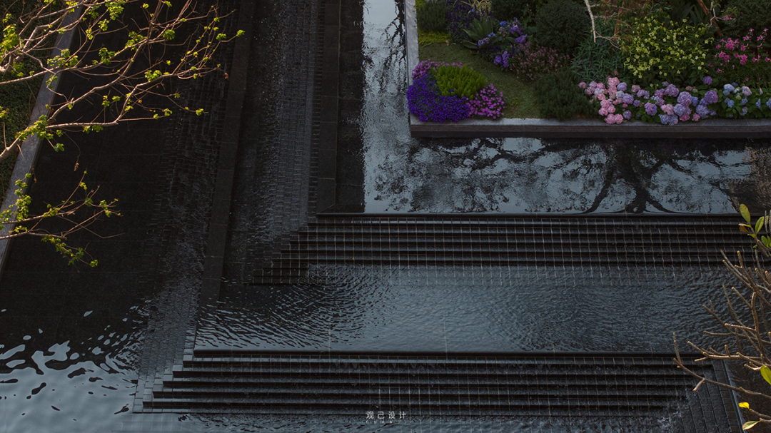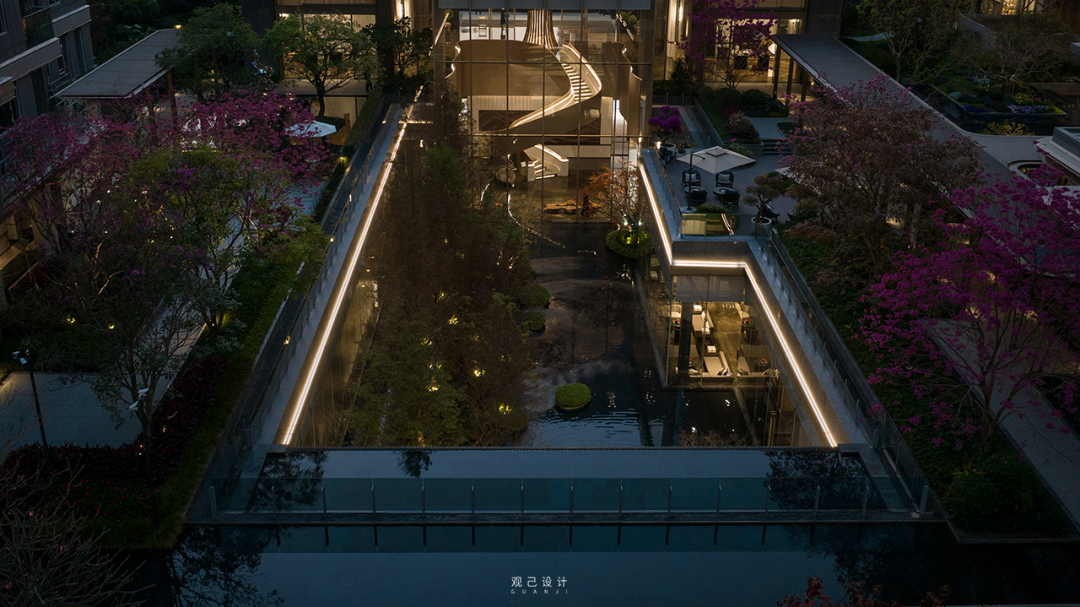 灵动水脉穿行建筑肌理,俯仰间皆成山水诗行。浮桥叠水、绿坡孤墙,6米立体落差营造“移步换景”的戏剧张力,让空间在光影中自由呼吸。