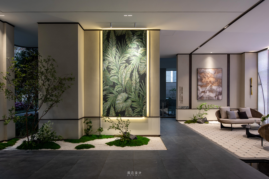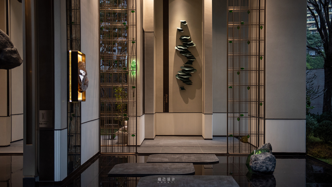 3750mm层高营造悬浮感,竹影摇曳、水声潺潺,绿植墙与透光格栅编织“都市绿洲”。