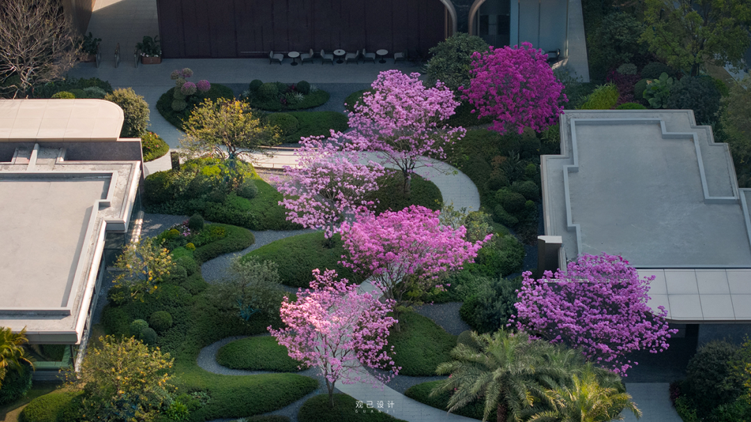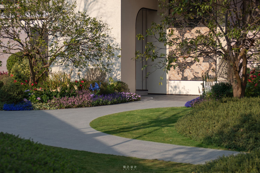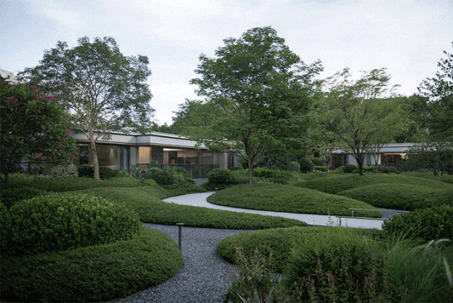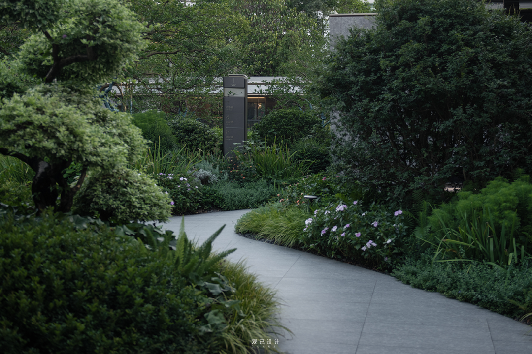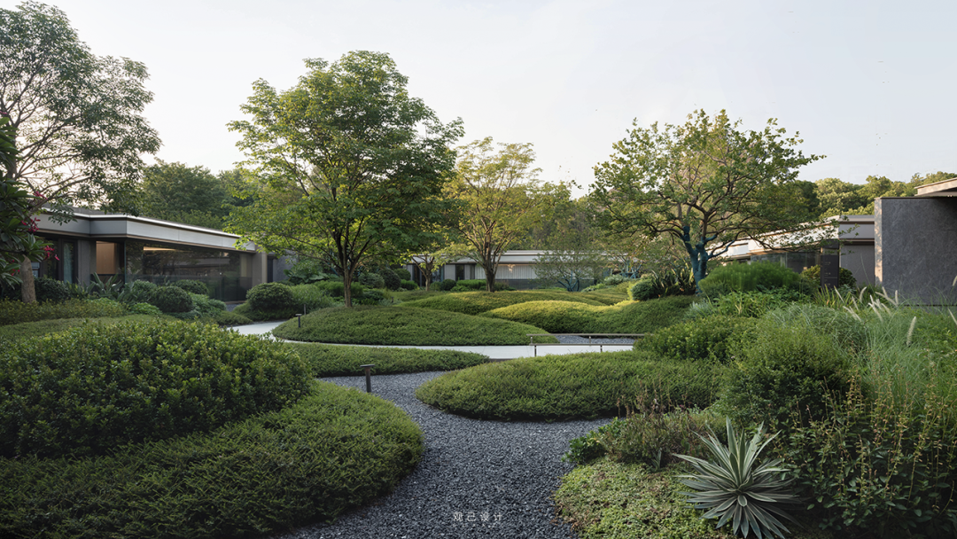 以流畅的曲线勾勒韵律之美,穿梭光影与绿意之间,石材与砾石元素展现了空间温婉与坚韧并存。