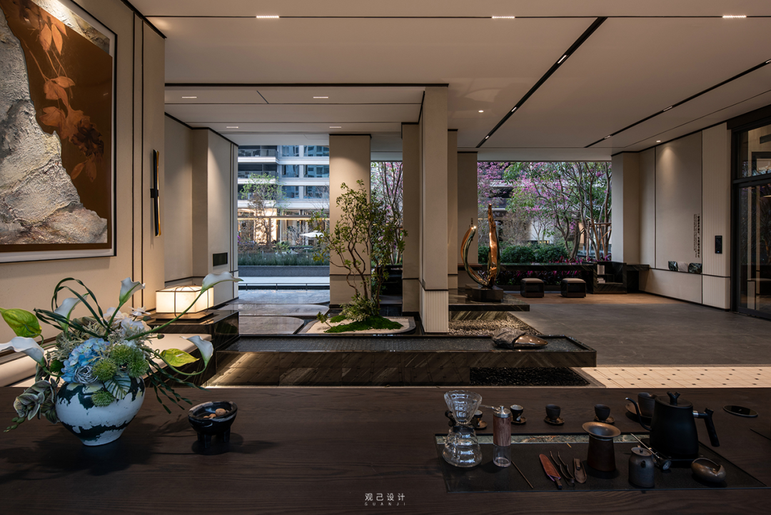 茶厅三面环景,270°落地窗将庭院竹海、叠水景观引入室内,品茗时仿若置身山野。