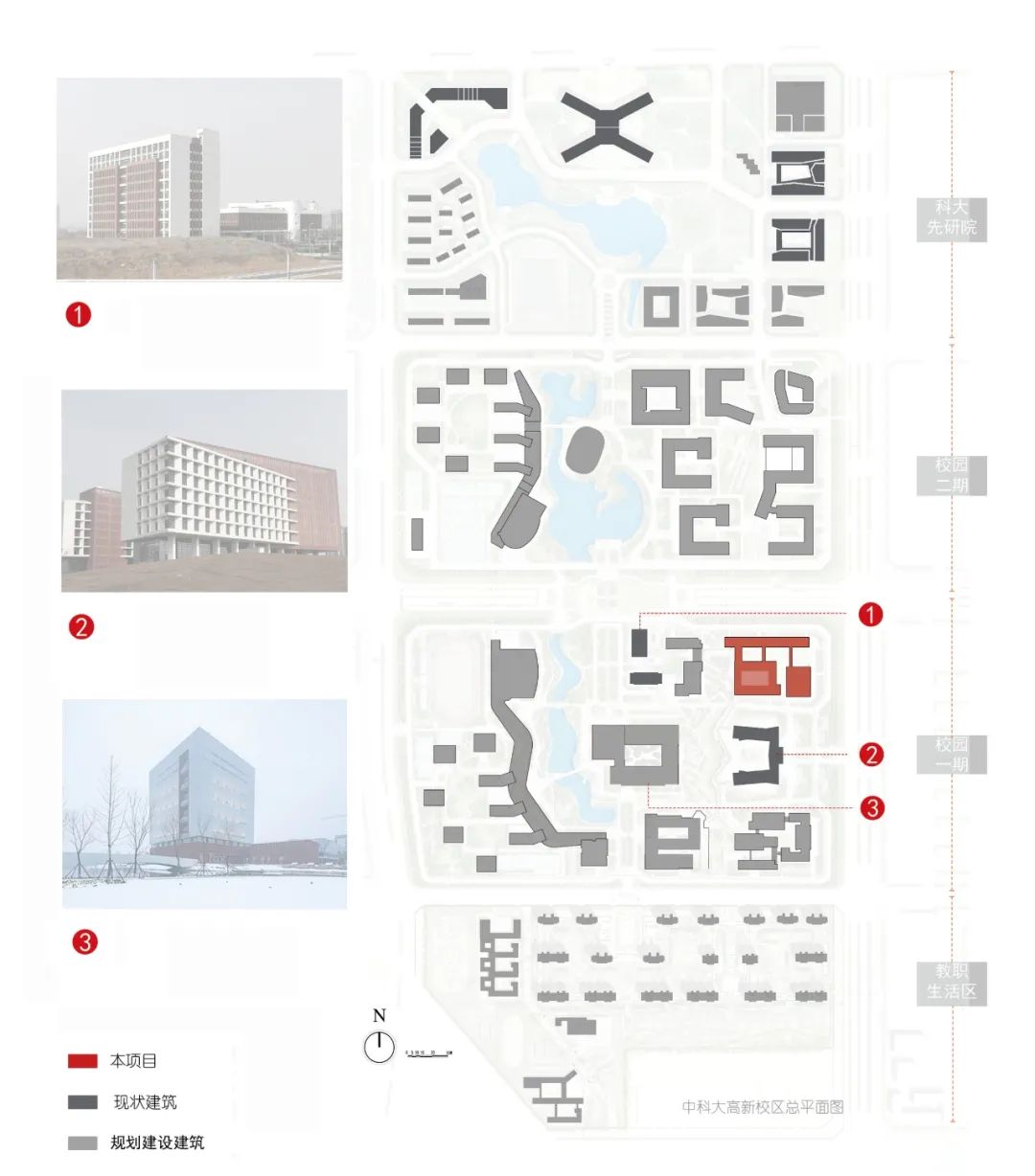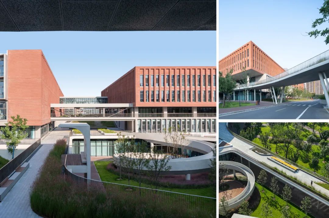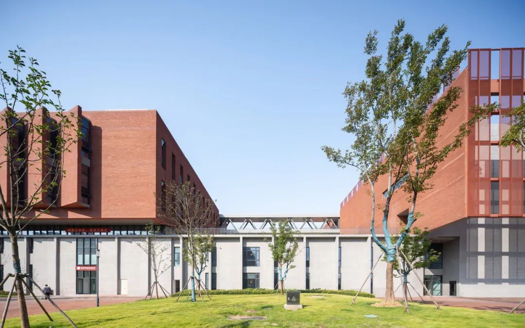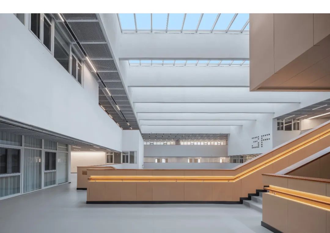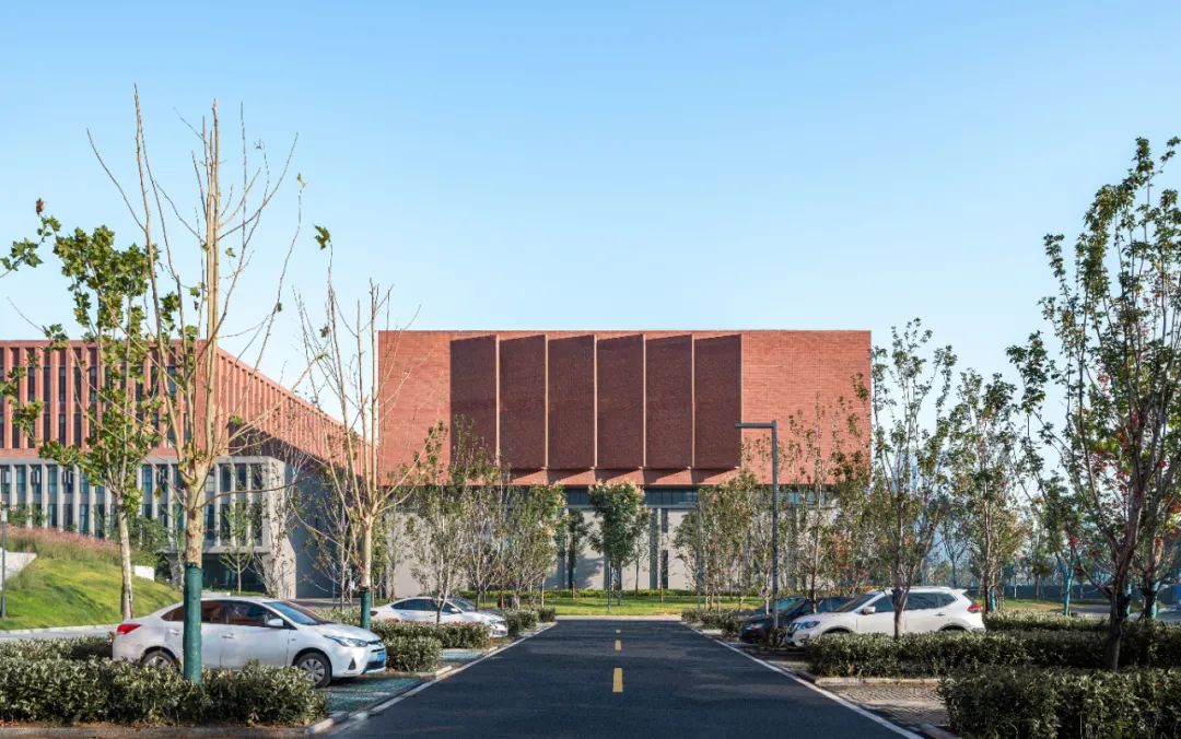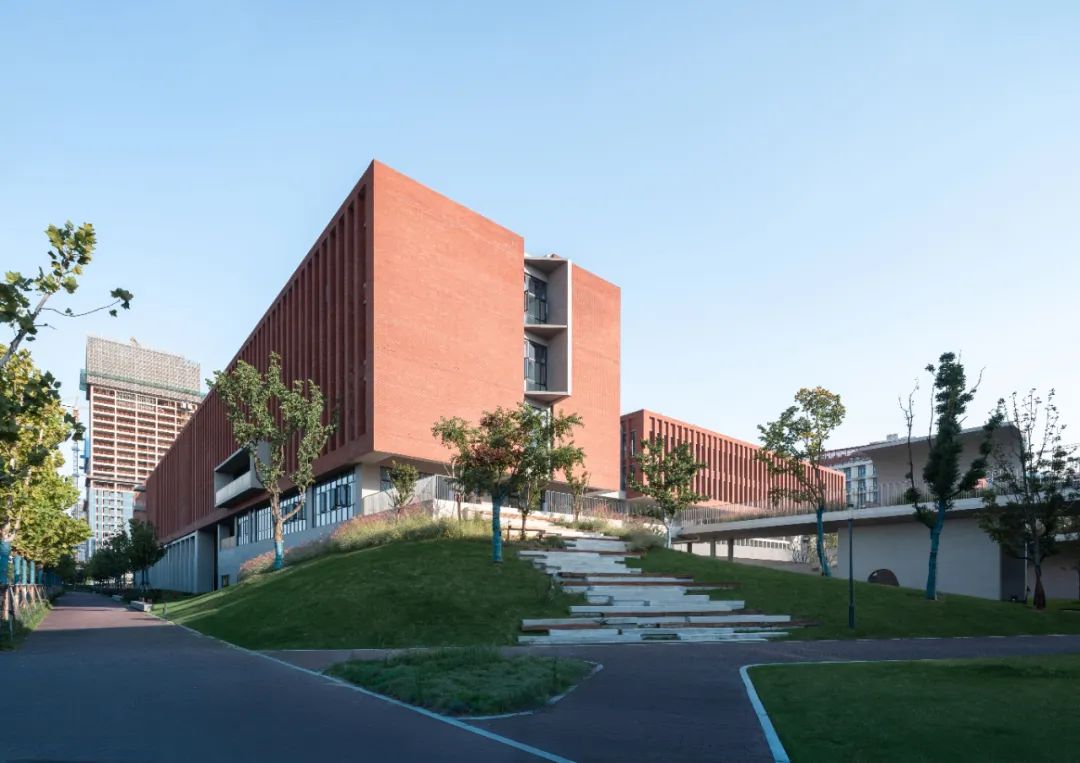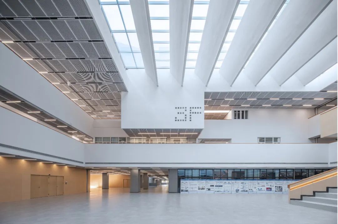 当夕阳为红色砖墙镀上金边,中庭的七根楔形巨梁在地面投下几何光斑,如同数字世界的二进制代码跃动在现实空间。建筑既以红色砖墙延续科大文脉,又以漂浮的巨梁天窗与空中连廊构筑未来图景,在严谨的秩序感中注入流动的交流可能。这里不仅是承载量子计算与人工智能的物理容器,更悄然塑造着未来学者的精神图谱,那些穿梭于空中连廊的身影,正将数据流的逻辑与人文的温度编织成新的校园叙事。这座"砖石容器"最终在时光中完成嬗变,以通透的公共空间成为激发学术碰撞的孵化器,以当代建筑语言书写出连接传统与创新、功能与人文的校园空间新范式。