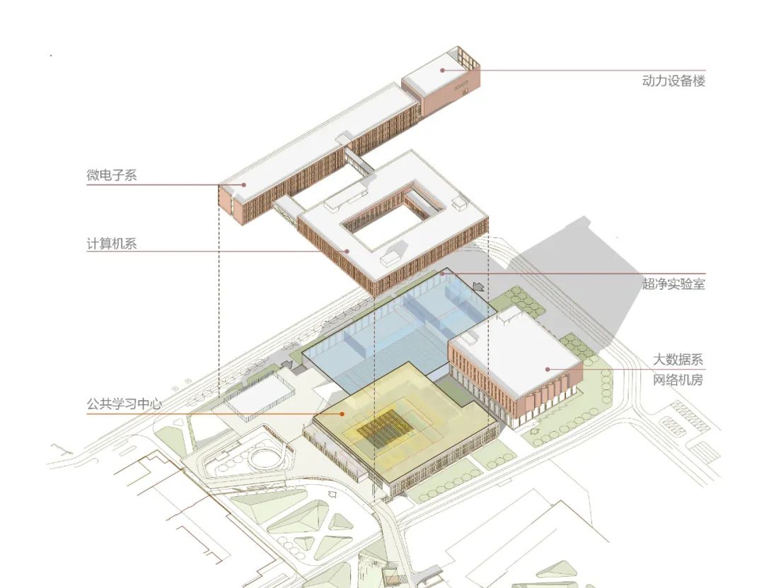 中国科学技术大学网络中心计算机大数据微电子学科楼,位于科大高新园区南校区的学科楼组团的东北端。一处颇具特色的校园公共景观连廊将组团内的学科楼密切联系起来。