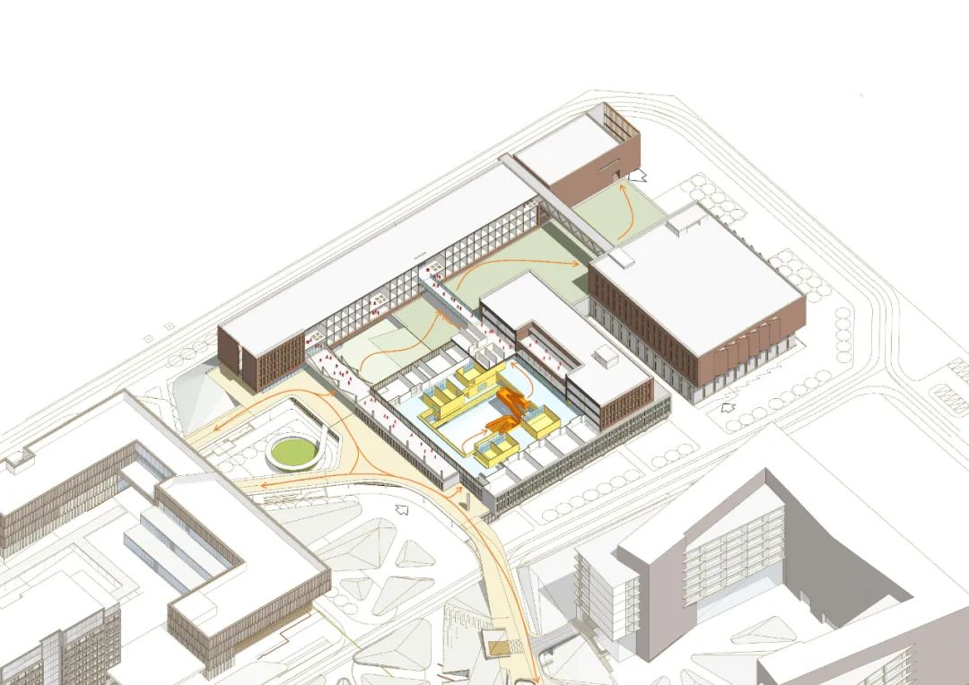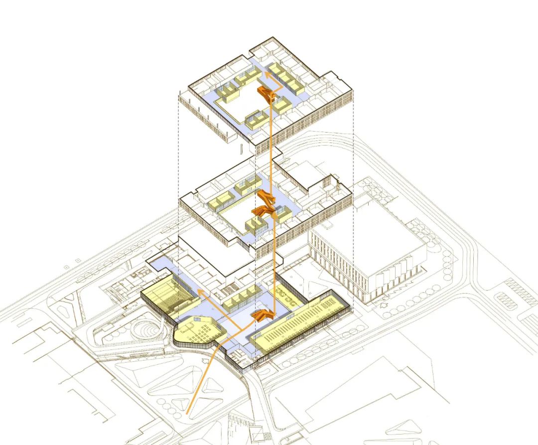 学科楼嵌入南校区几百米长的二层景观连廊,并将廊道与绿化自然的融入引入到屋顶花园。学科楼的公共学习中心作为“芯片”,蔓延出三条空中连廊,与教学楼模块和网络中心密切“链接”。