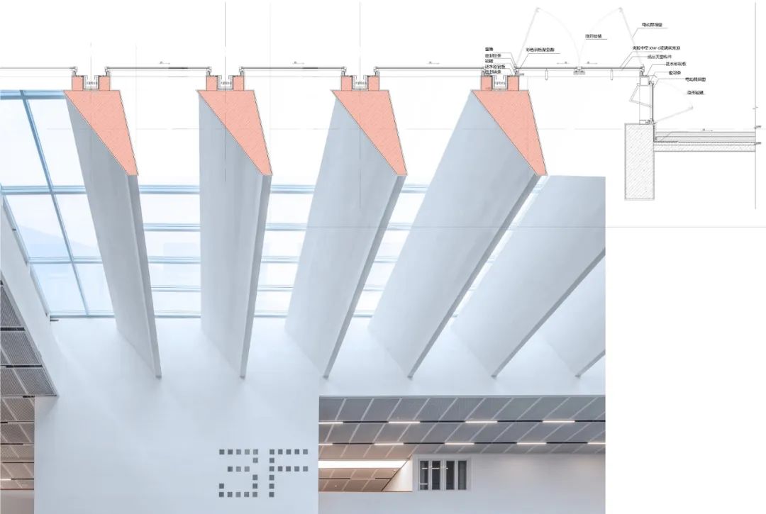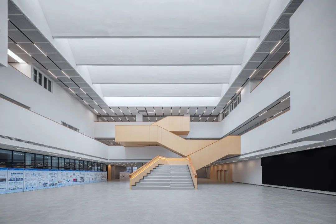 公共学习中心位于学科楼底层,室内空间契合使用功能,以“漂浮的芯片”为概念,围绕中庭的方盒空间,与沿护栏的开放自习场所,鼓励随时发生的交谈和讨论。楼梯是中庭的焦点,适宜在天光下缓步行走,随时落座。三层通高的大厅,27米长的天窗,依靠七根楔形巨梁撑起,巨梁在垂直向度上的变形暗示结构构件的受力,通过构件的方向感,控制进入室内的光线。