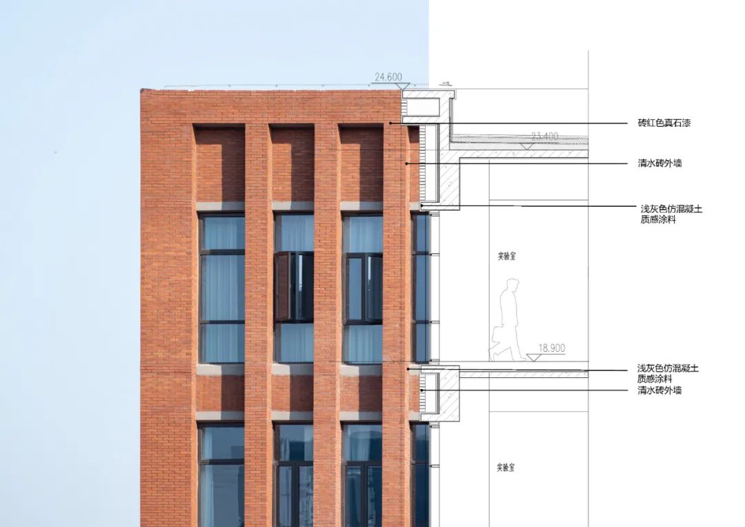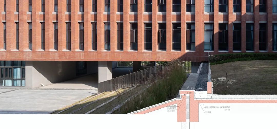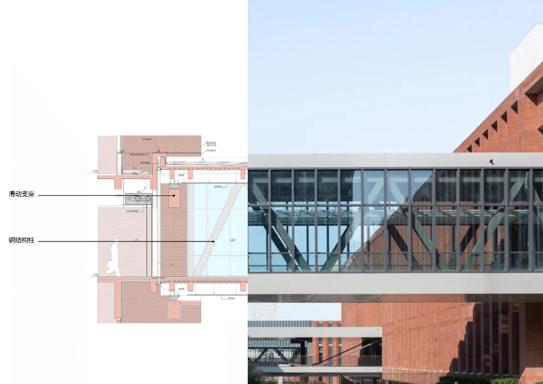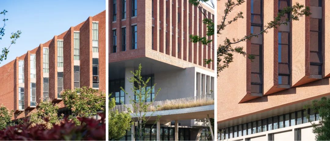 学科楼外墙采用红色清水页岩砖砌筑,砖墙肌理承载着中科大的集体记忆。基于砖的尺寸排列出充满秩序的壁柱,精致的细部构造隐藏住变形缝,在真实呈现和精致设计之间取得平衡。素朴的学科楼就像一块坚硬的砖,在这个特定的空间和时间的坐标点上,注视着变化着的校园。