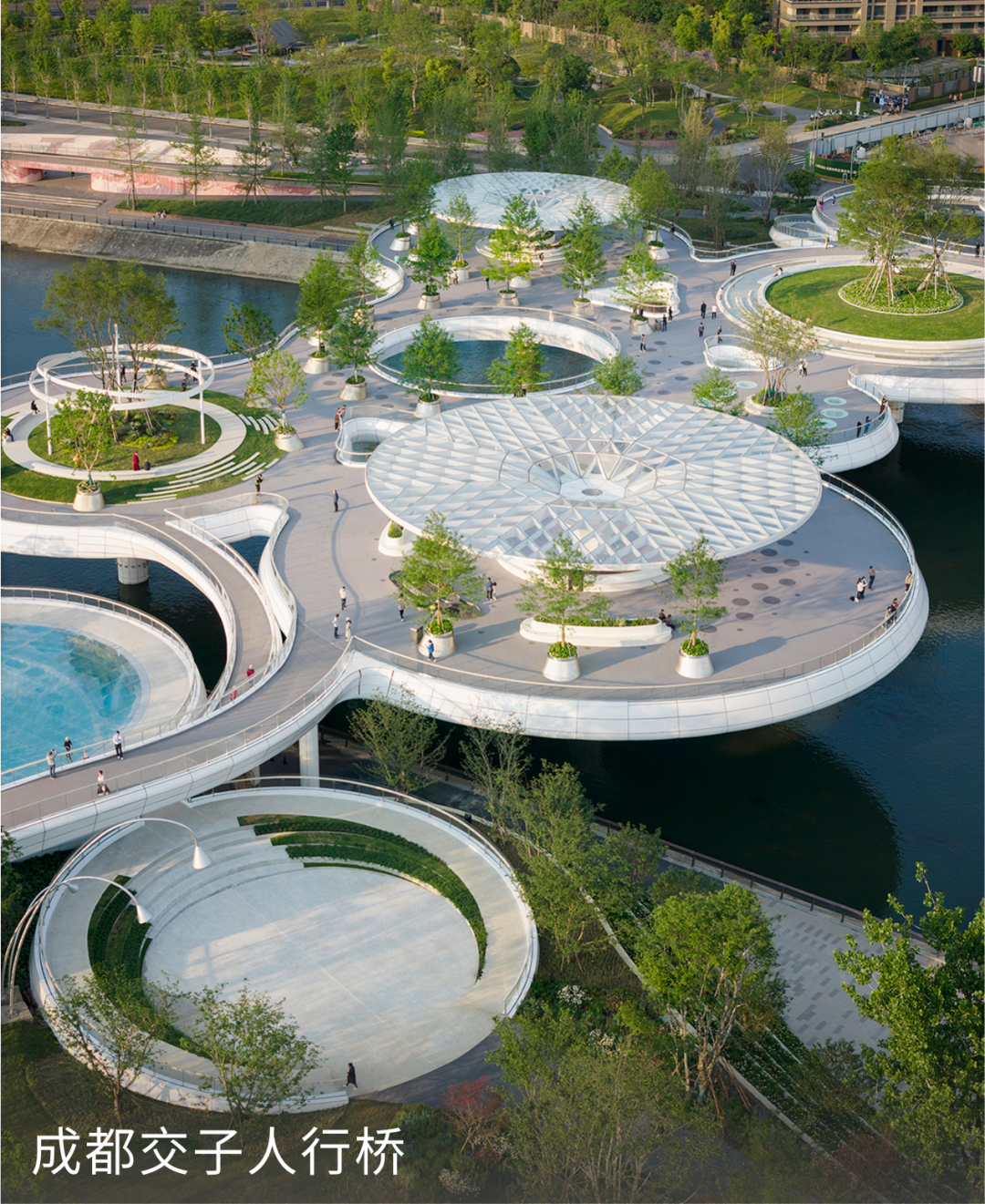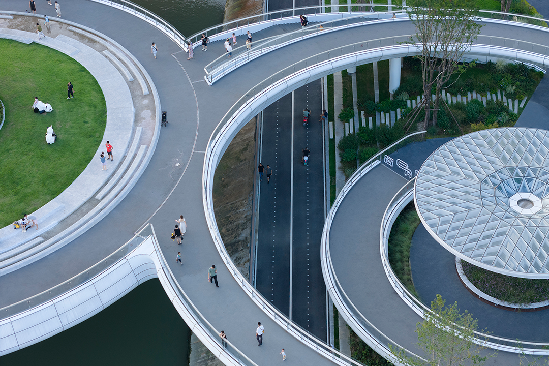 这是一处桥与公园的混合体,全长498米,包括横跨河西、河东两条市政道路的引桥,以及跨越120米宽河面的主桥,还有与之垂直交叠的原有南北向的滨水绿道。为实现人行衔接与无障碍通行,步道系统分成三个标高系统:包括跨越河道与市政道路的上层、市政道路的中层,以及河堤绿道的下层。各层间通过坡道、楼梯与电梯连接。立体交通和分层绿化让人联想起曾经的巴比伦空中花园,作为对古代建造先驱的致敬,交子人行桥再现了“人在空中游”的景观梦想。