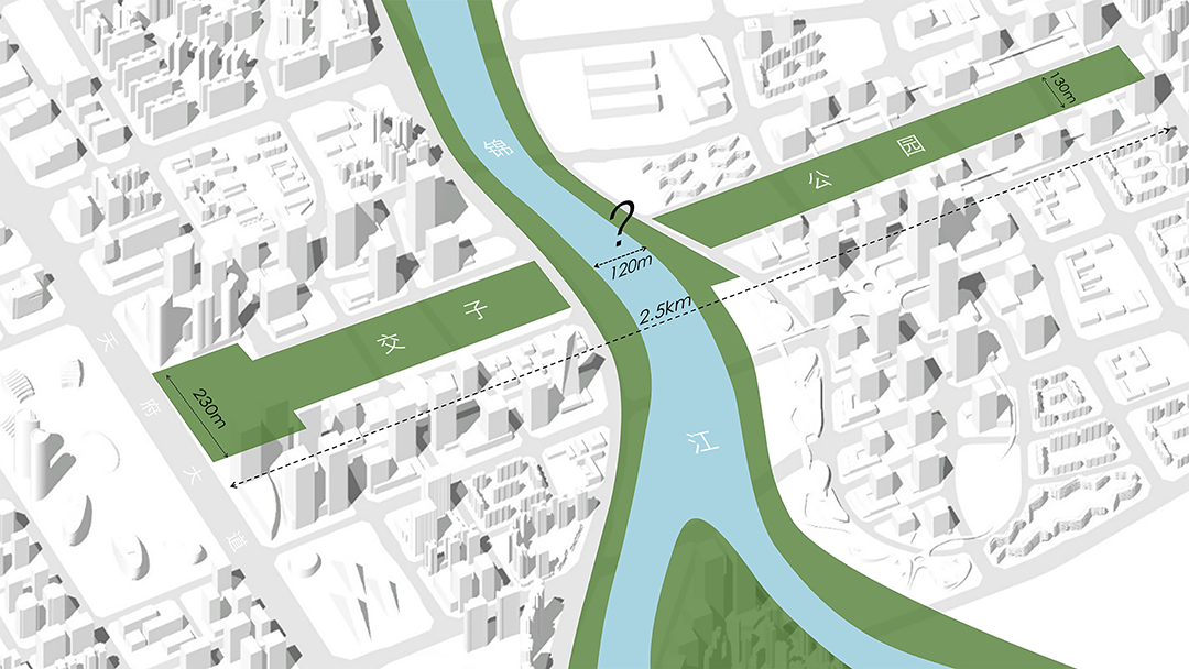设计的起点就是不断地提出问题。首先我们回到城市结构的观察:锦江自北向南穿流而过,将交子金融商务区分为河东与河西两个长条形街区。东西方向延绵2.5公里长的交子绿带,被锦江分为两段,成为隔岸相望的公园。锦江与中轴绿带的十字形交汇处,便是城市空间的天然断点,需要建立一个强有力的连接。建设一座人行桥,不仅可以连接两岸街区,实现城市步行系统的贯通,也能将交子绿带连为一体,实现与河流的“蓝绿交汇”。