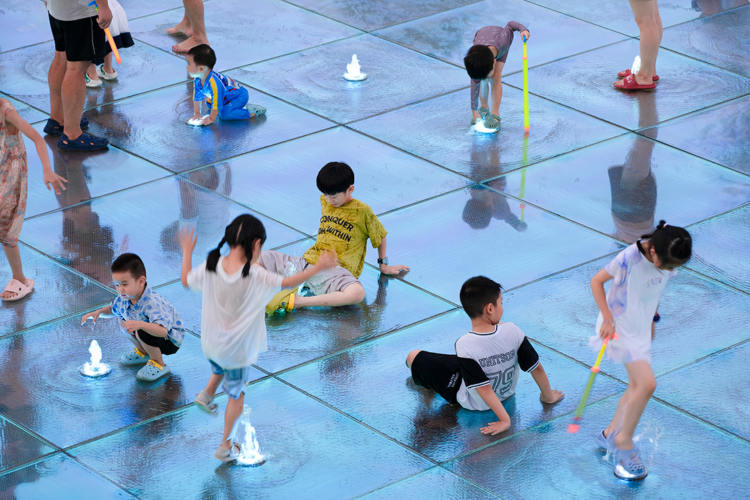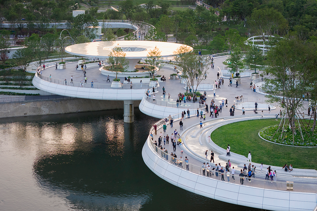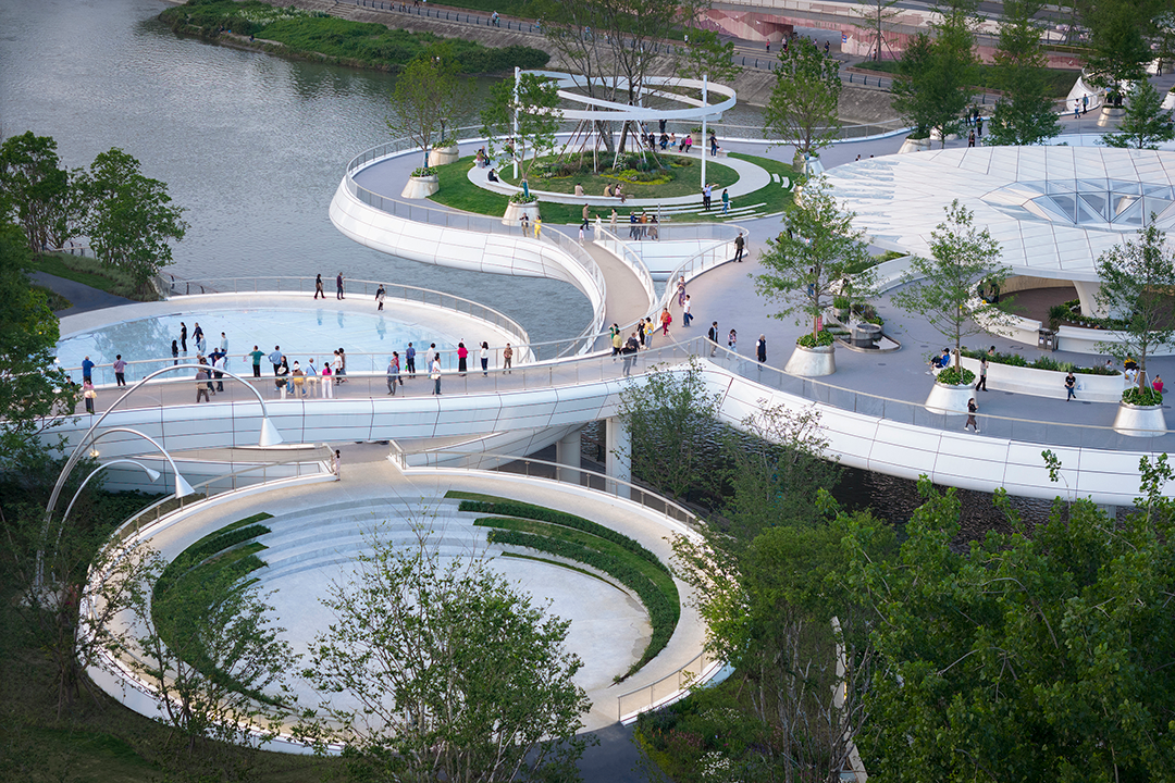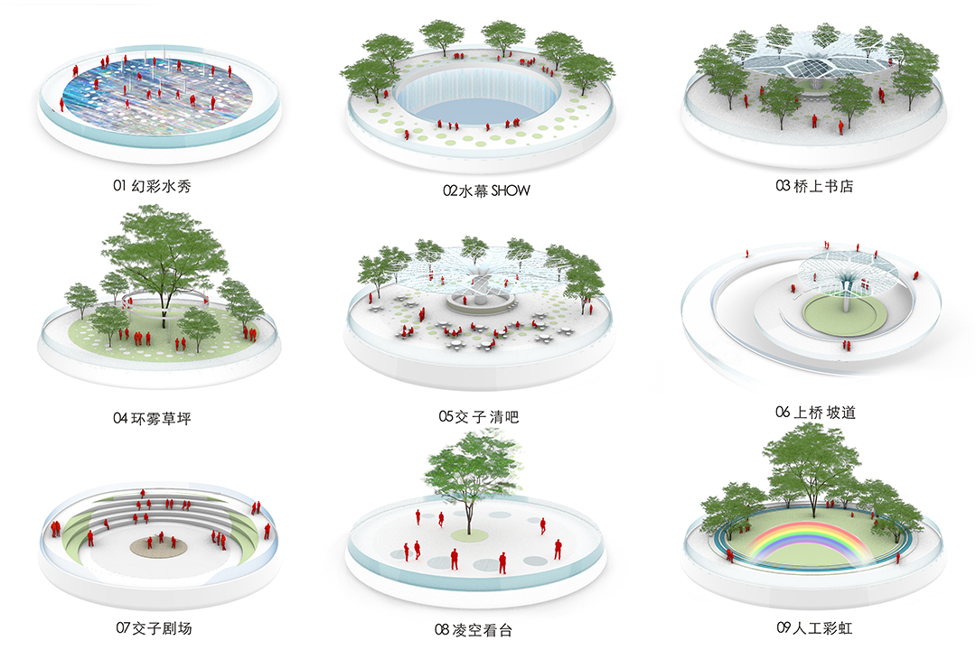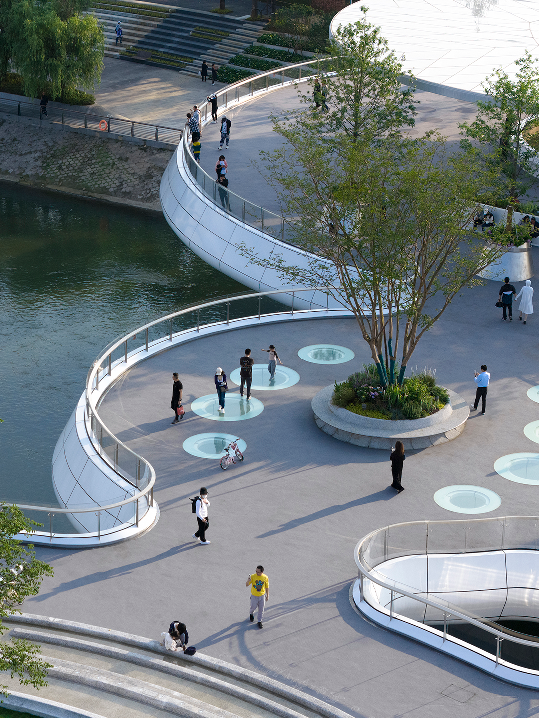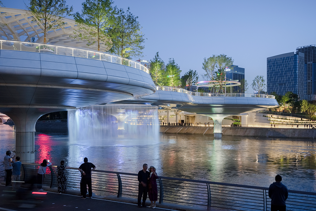成都生活开放闲适,欢迎人们的全时段参与。9个圆盘单元既是一个整体,又是9处相对独立的活动场景。莲叶亭下的水吧,可于此把酒临风,创造动人的消费场景;24小时无人图书馆,向周边社区提供小憩阅读的空间;圆环剧场顺应河岸高差,是户外表演的场所;幻彩水秀由喷泉和幻彩玻璃组合,是孩子们嬉戏的缤纷幻境;戏水花园,孩子们或躺或坐,绕水而逐,获得了与水“视、听、触”的多重体验;中段的桥面镂空成环,方便人们趴在洞口俯瞰河面;围绕圆环布置水帘,夜间开启光影秀,成为市民拍照打卡的热点。