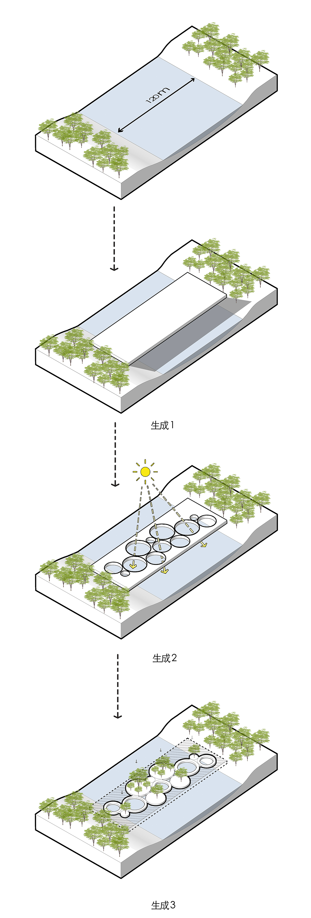 交子绿带宽度约150米,作为绿带跨河的部分,桥面不能太窄,否则难以形成连续的绿轴。但若采用宽幅式断面,将不可避免地遮盖河道,投下大片消极的阴影。于是我们设想了一个“多孔”的桥,让阳光得以穿透桥面的孔隙照亮水面。