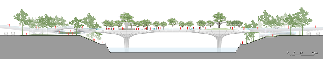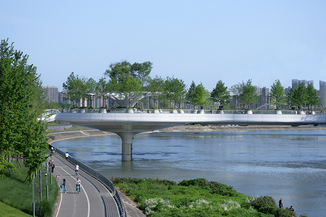 通过单元加法和开洞减法的混合,设计最终获得了“莲桥”的集合形态,多个“莲叶”悬挑单元实现了足够的覆盖宽度,圆盘之间又能够留出空隙,让阳光、风雨和视线穿行,人工桥梁与自然河流得以同频呼吸。9个大小圆盘单元同形异构,面积从300到1600平方米,其上种植乔木,与河岸绿地连接成片,成为一处漂浮的公园,悬于锦江之上,行走其间,“步步生莲”。桥体曲线灵动,虚实相间,桥面与倒影相映成趣,每一段悬挑的弧线阳台都成为人与河流对话的界面。