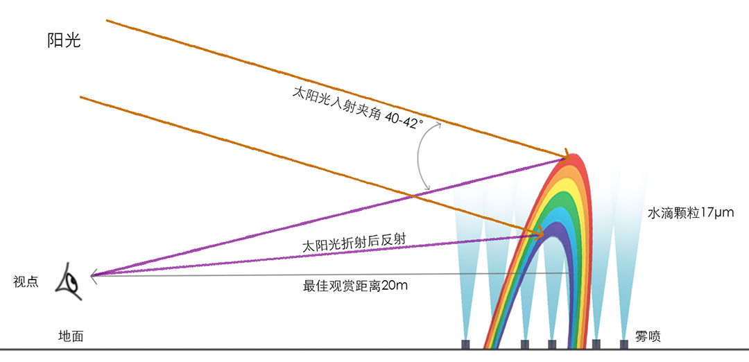 彩虹连接了科学和美学的双重维度,被视为自然现象与人类情感间的桥梁。有没有可能在桥上再现自然界的彩虹胜景?通过对日照角度分析,模拟彩虹的形成条件,利用雾喷形成水幕,在特定的时间段折射太阳光,创造30米宽的人造彩虹。“遇见彩虹”成为与大众共情的交点,为“桥”这一古老类型注入了新的情节。