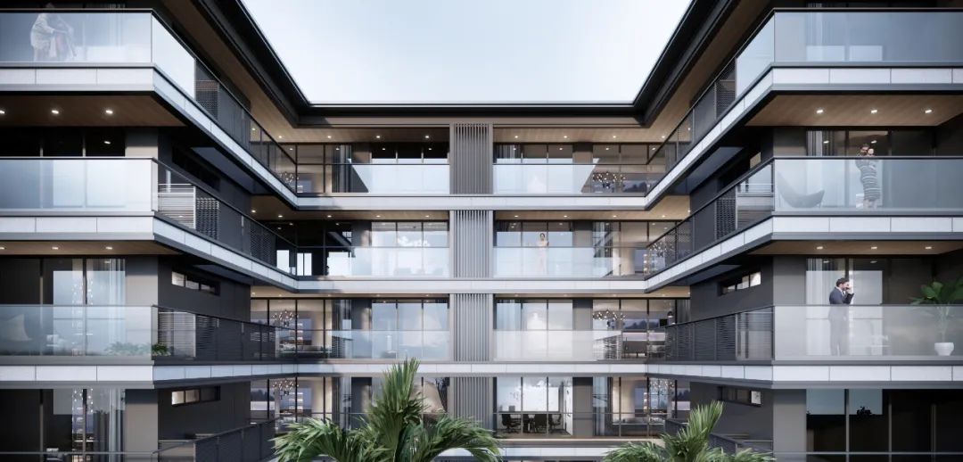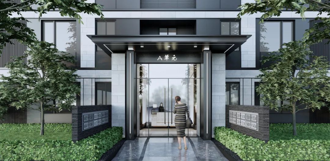主入口的设计与开敞空间相结合,为整个归家动线和城市界面增添层次感。同时,二层结合露台的设计将与一体化的生态景观相融合。入口大堂两侧将布置社区配套设施,弥补周边区域配套稀缺的不足。