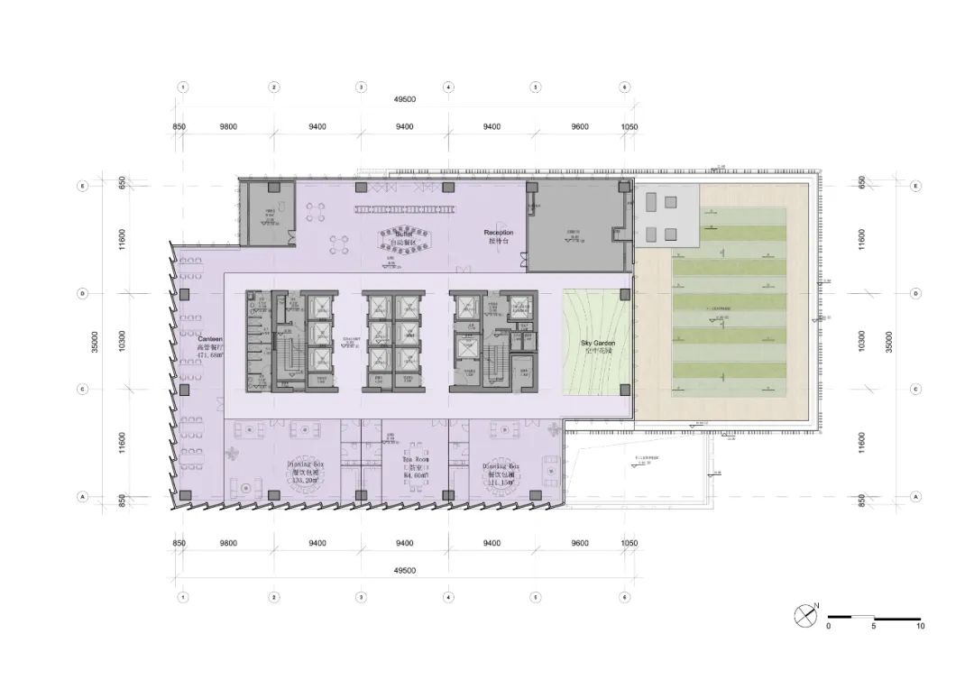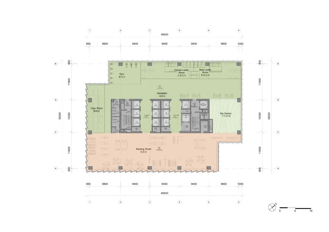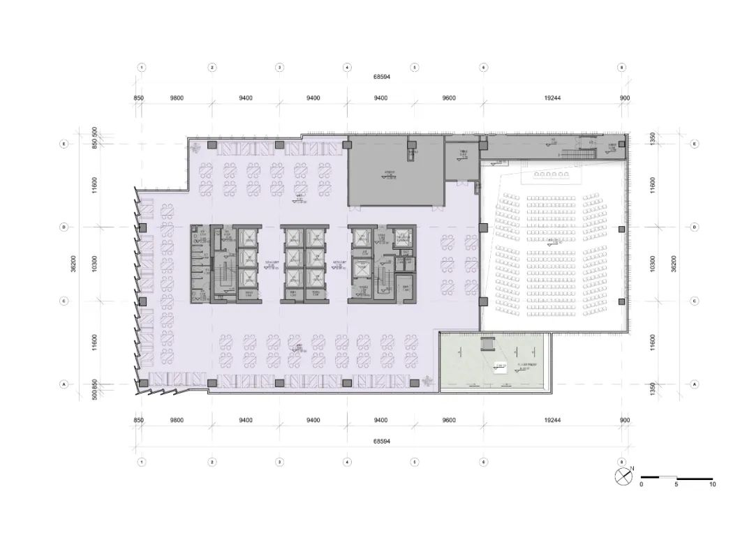 总部大楼的设计充分考虑了现代企业的多元化需求。空间布局精心规划,设有中西式会议室、可容纳350人的报告厅、员工食堂、健身房、阅读室及员工交流活动区等功能空间。二层平面图(报告厅,休息区)