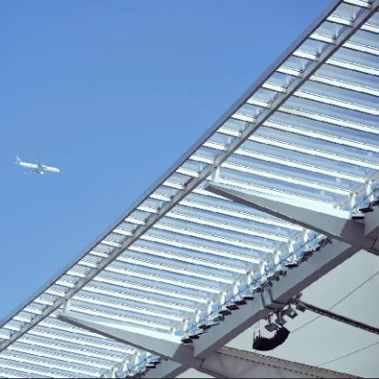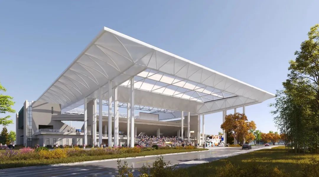 罩棚固定部分采用30mm聚碳酸脂空心板系统,轻质高强并具有良好的水密性和抗风揭设计,开启部分为PTFE膜结构,三片弧形造型结合鱼腹钢梁,塑造轻盈飘逸的造型效果。罩棚立面采用膜结构弧形飞檐设计,强化舒展漂浮质感。