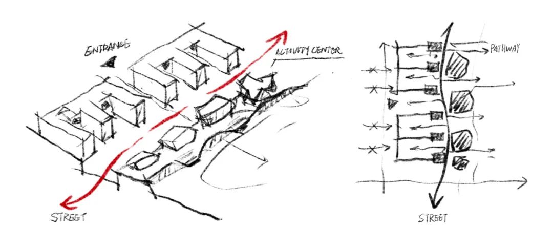 自南向北,校园中轴线上的一条曲折主街将整个校园联结起来,沿途步移景异,绿意盎然的地景公共空间、教学楼趣味十足的山墙面与庭院空间依次展开。这条街道不仅链接了教育教学、艺术人文、聚集活动三个核心区域,更为学生提供了在“街头巷尾”观察、探索、邂逅与交流的机会。