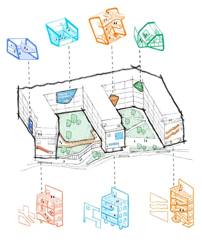 The teaching area forms a rhythmic spatial sequence of “terminal space – corridor – sky pocket park,” embedding opportunities for interaction and learning throughout the campus experience.Through staggered floor plates and strategic program placement, they create a multi-layered system of semi-open “grey spaces,” where students can spontaneously engage in conversation, discussion, performances, or hands-on activities as part of their daily movement through the campus.