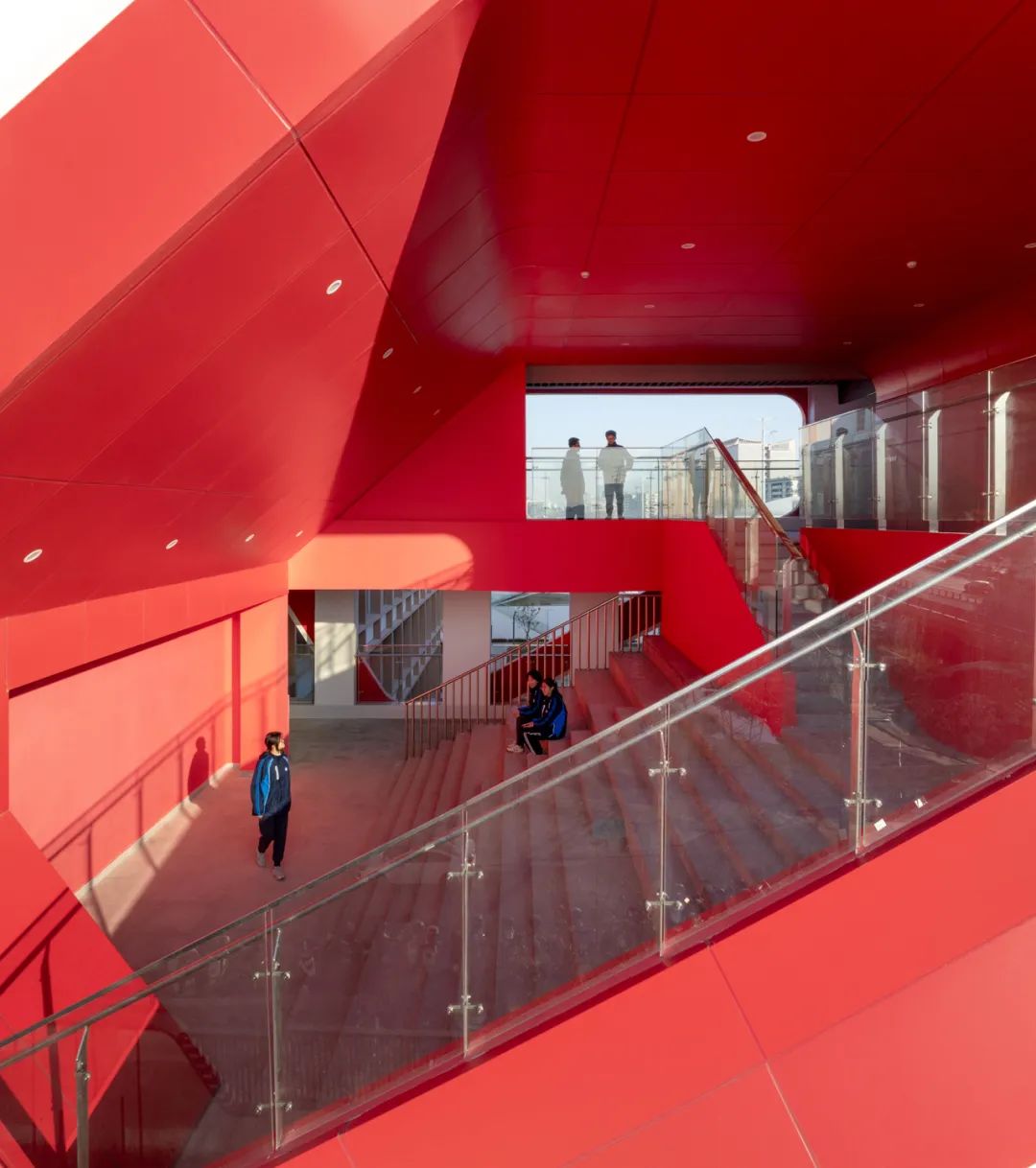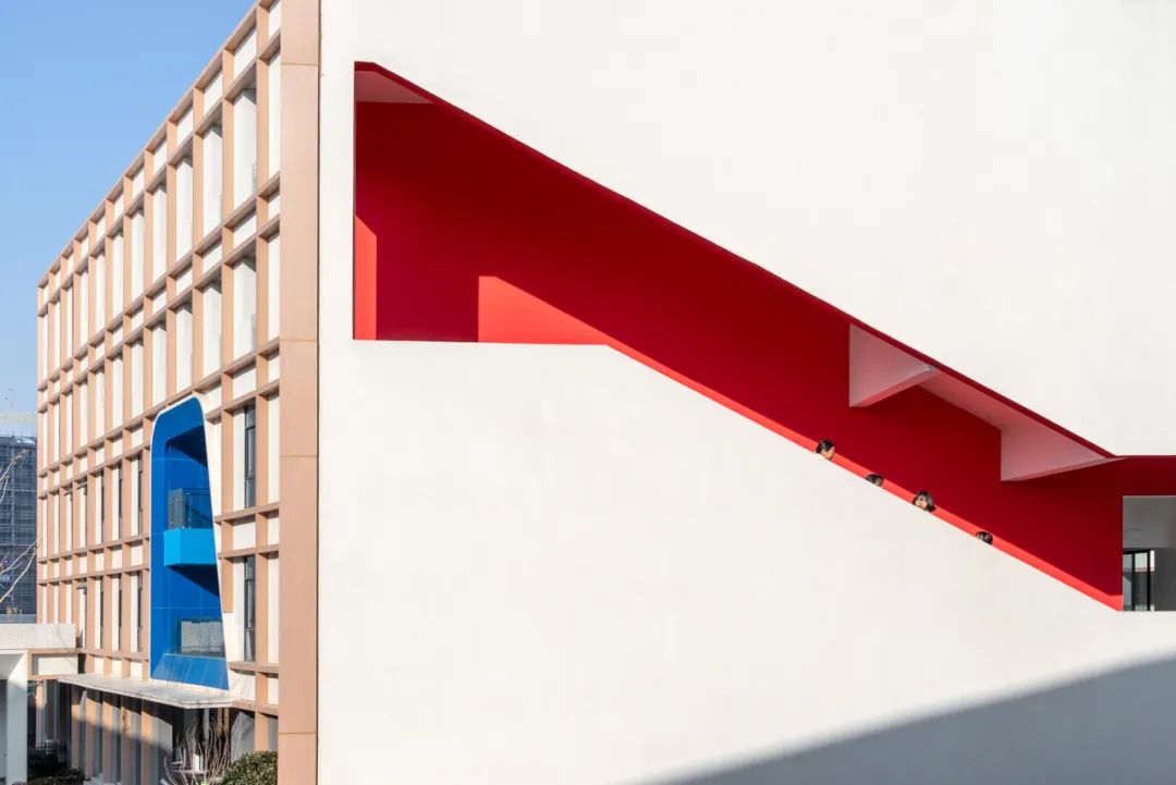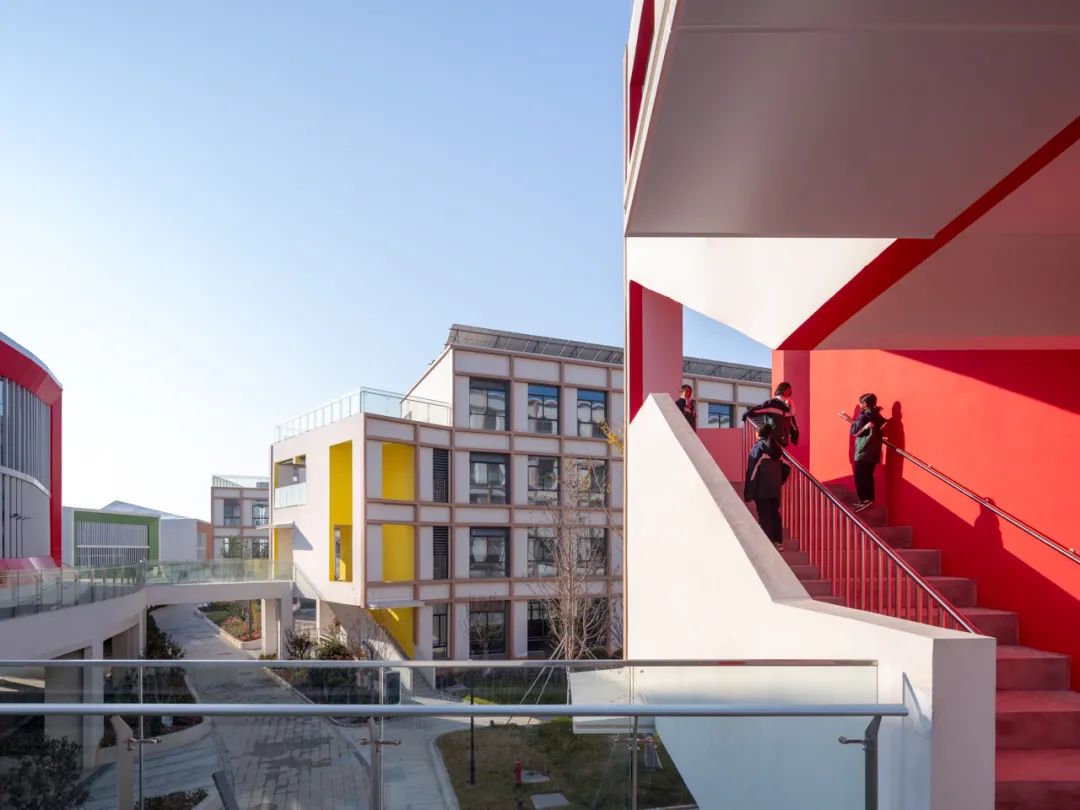 On one side of the main campus street, the teaching area comprises two "E" -shaped academic clusters. The gable-end facades of these buildings are designed as spatially "thickened" terminal volumes, ingeniously integrating single-flight and double-flight staircases that connect rest platforms and transitional spaces. At the top, these volumes open up into rooftop terraces; at the base, they form sheltered, open-air entrances. Through contrasts of solid and void, the use of color, and variations in form, the design enhances the visibility and identity of these terminal spaces—establishing them as key markers along the campus street.